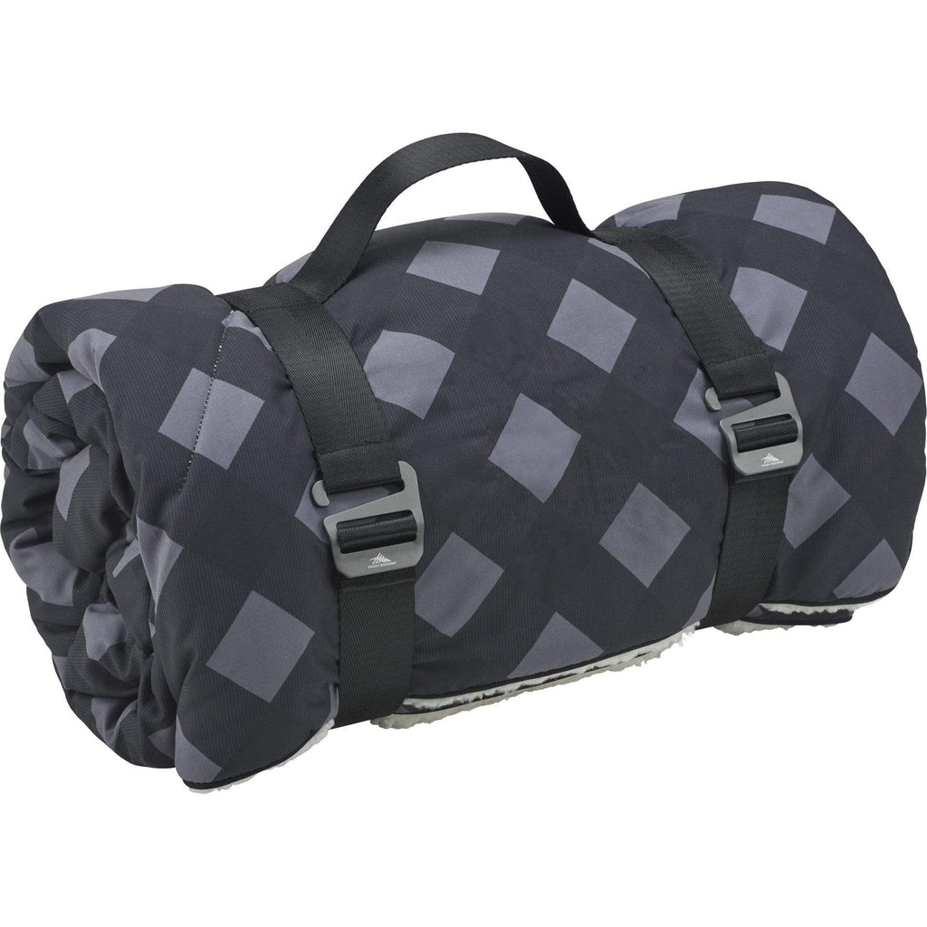 This High Sierra Sherpa blanket is one of the warmest available due to a 3 layer, quilted design that makes it perfect for indoor and outdoor use. Top layer is water resistant and a trendy plaid design, middle layer is cotton insulation, and under layer is a cozy Sherpa. Rolled up in a convenient package with nylon straps and laser engraved High Sierra aluminum clips, this blanket can travel with you anywhere