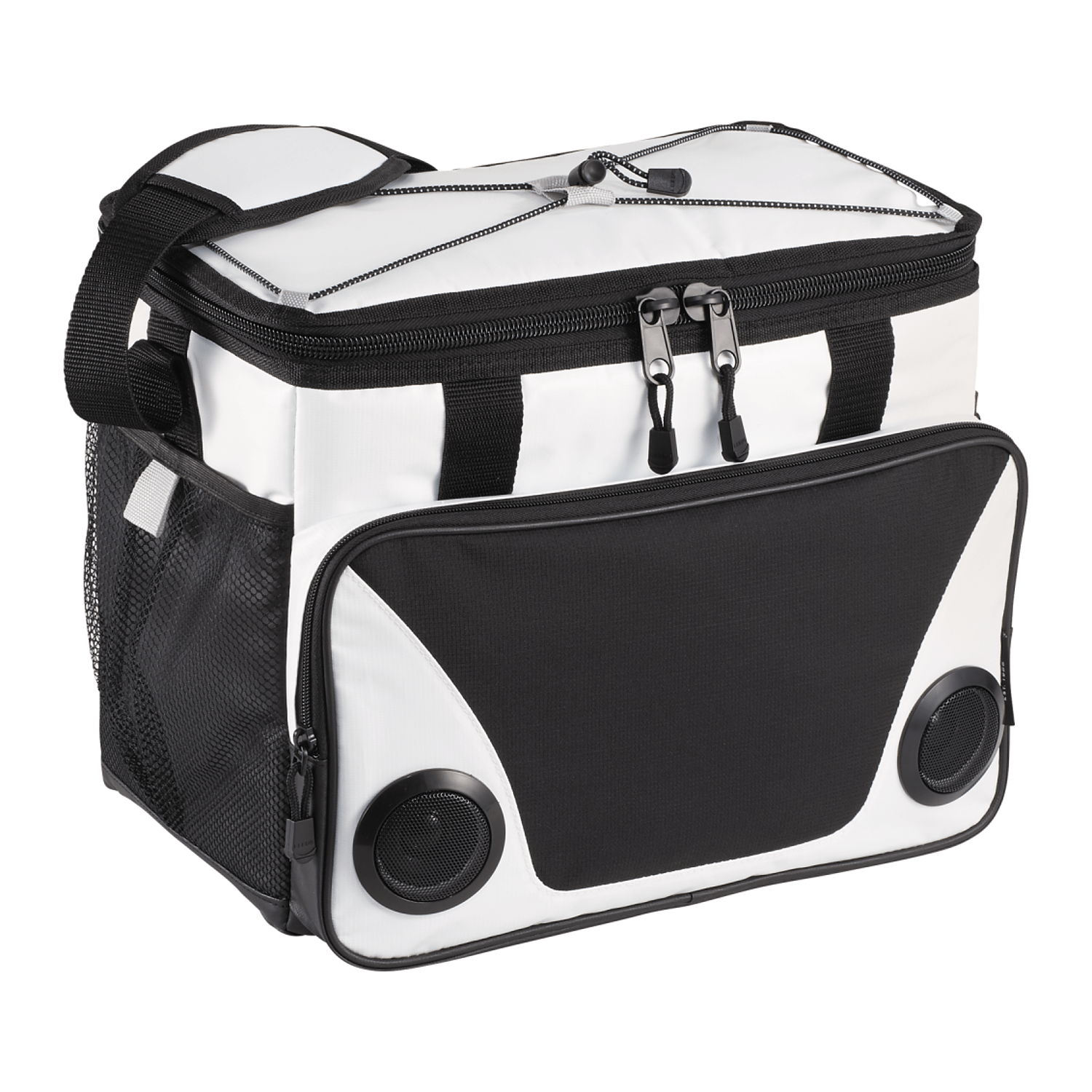 Made with Deep Freeze® high performance insulation, an integrated heat barrier and Cold Block™ base help keep still ice for 2 days! Main compartment hold up to 24 cans. Includes two mounted Bluetooth compatible speakers that work with any device with Bluetooth capability. Simply pair the speakers to your device and stream your favorite movie or music. Battery life of Bluetooth speakers lasts approx. 3-4 hours under mid-volume, or 2-3 hours under maximum volume.