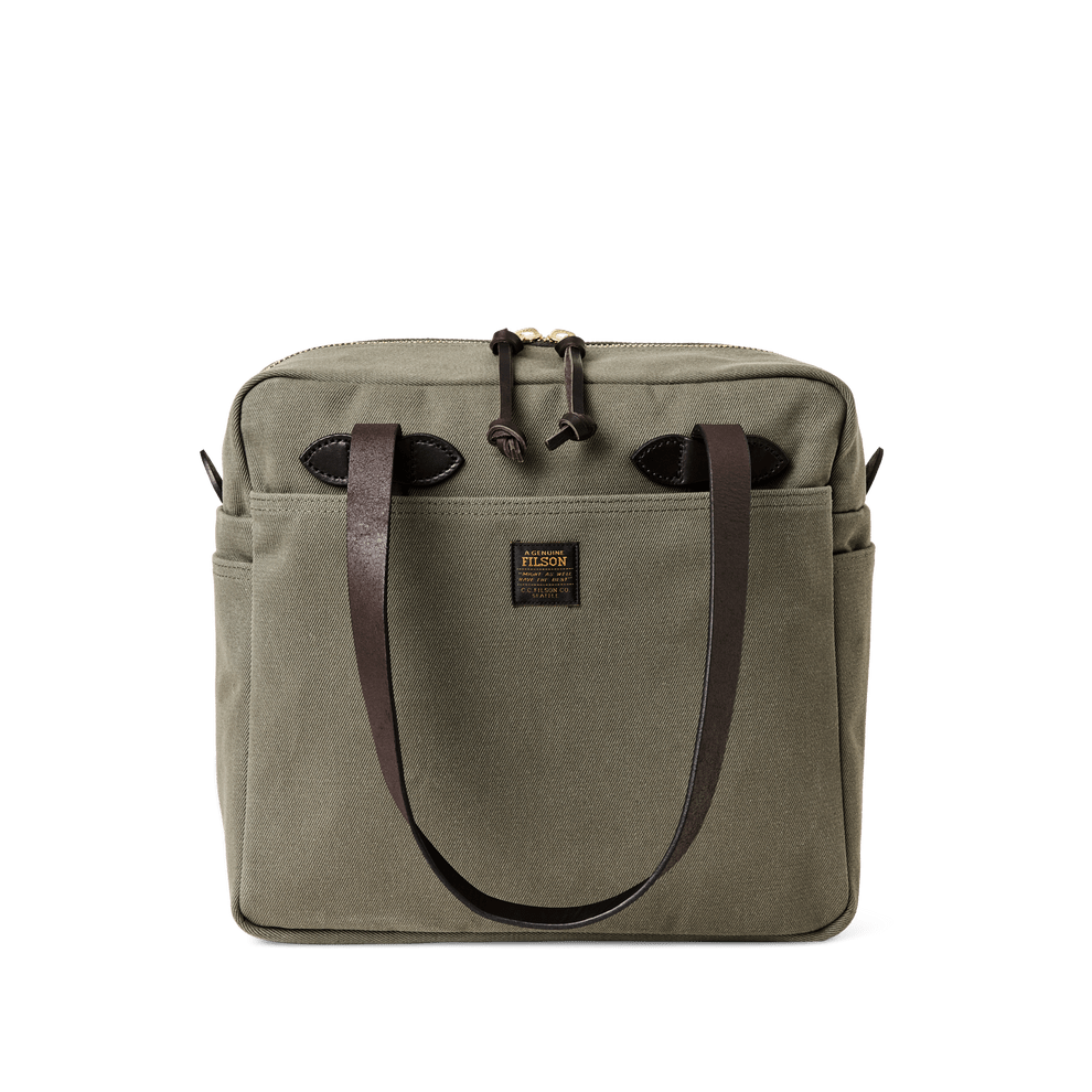 Our classic Tote Bag with Zipper, built with our signature, industrial-strength Rugged Twill and Bridle Leather, is the most versatile and useful bag you'll find. The lightly waxed fabric is water resistant and withstands the rigors of daily carry. The handles, made from Wickett & Craig Bridle Leather, are long enough for over-shoulder carry. Pockets on all four sides to keep gear organized and close at hand. Solid brass YKK® zipper.