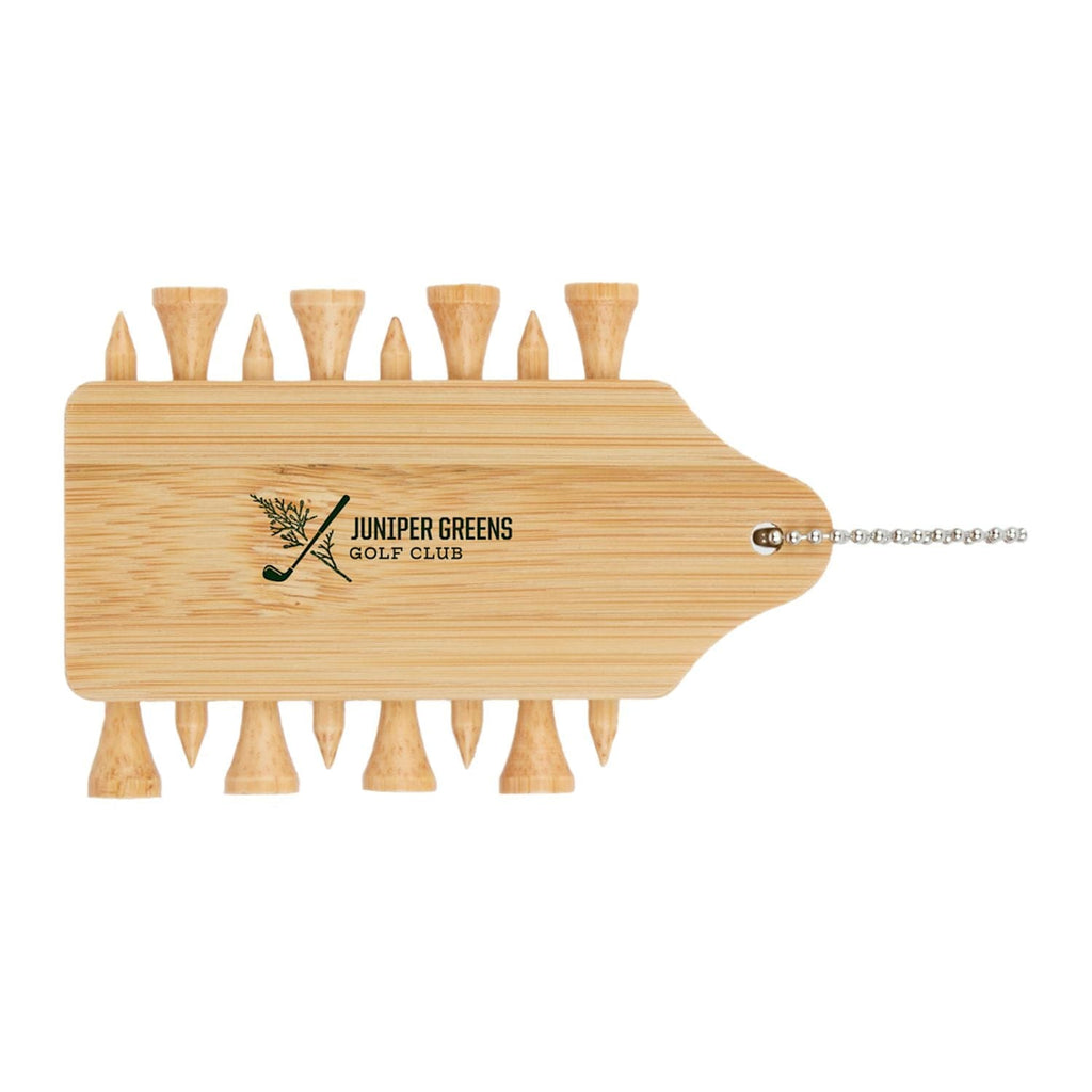 The Bamboo Golf Buddy includes 8 durable 2.75” golf tees that fit snuggly inside the bamboo tee holder. It has a compact design that makes it easy to toss in your bag, providing the perfect addition to your next day on the green. Secure the golf tees to any bag using the included carrier chain. Beginners and experienced golfers alike are sure to appreciate this useful accessory. Tees and tee holder are made from FSC-Certified bamboo sourced from responsibly managed forests.