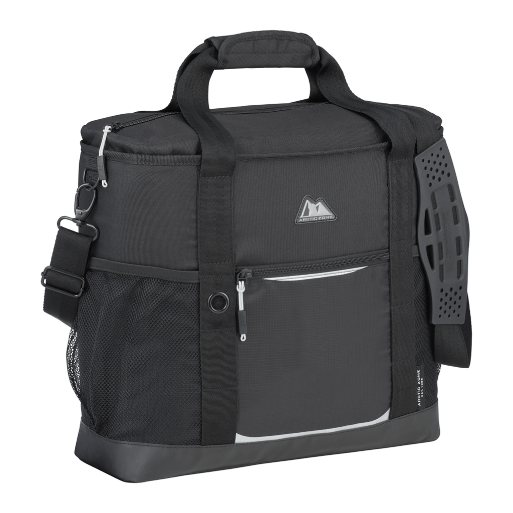 The Arctic Zone 30 Can Ultimate Sport Cooler features a sturdy, PEVA lining that keeps contents cold and prevents leaking. The cooler is easily portable with an adjustable shoulder strap and grab handles. The Ultimate Sport Cooler can hold up to 30 cans with a zippered main compartment, two side mesh pockets and a front zippered pocket.