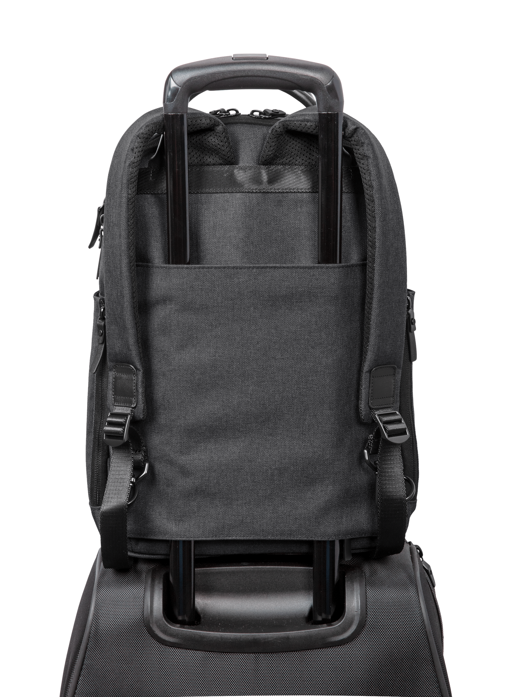 Zippered luggage trolley pass through on back
