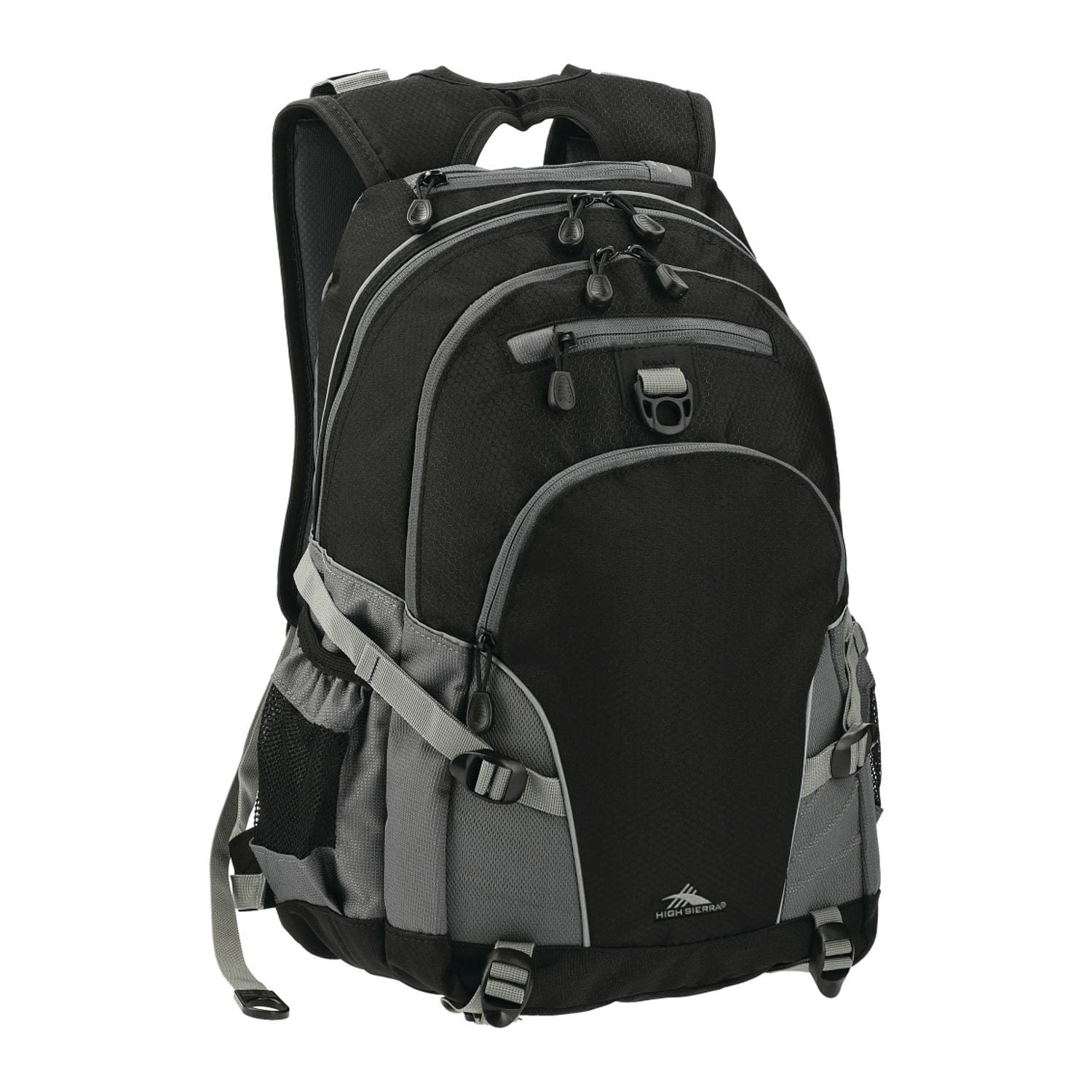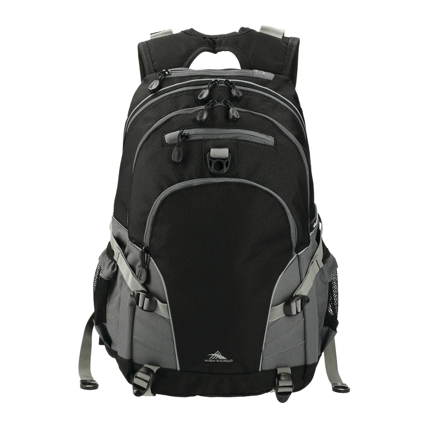 The High Sierra Loop Backpack features a multi-compartment design to provide you with ample storage. It's packed with convenient features, including a zippered media pocket with a headphone port, two side mesh water bottle pockets, and a hanging accessory pocket. The backpack also comes with an organizer that has a zippered mesh pocket, built-in pen pockets, and a removable key fob. Its yolk-style, S-shaped Vapel mesh shoulder straps and padded back panel are designed for comfortable wear, along with its adjustable waist belt and integrated grab-handle.