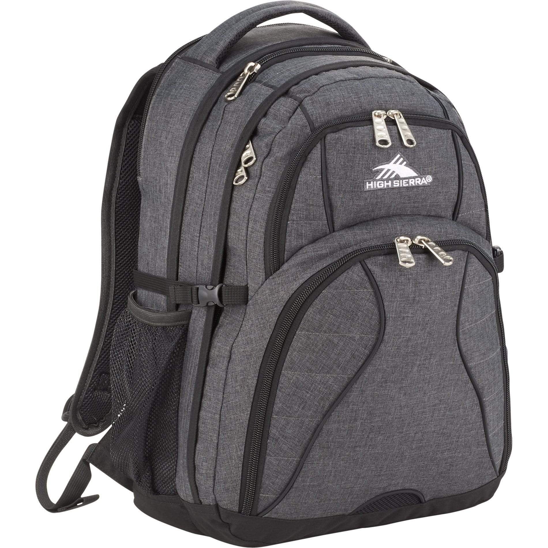 The High Sierra® Swerve 17" Computer Backpack has a padded interior computer sleeve (holds a 17" laptop) with an easy back-access zipper. It features an organizer compartment with multiple pockets, a zippered mesh pocket with a key fob and a handy media player pocket plus a valuables pocket for a smartphone. Side mesh water bottle pockets. S-shaped Vapel™ mesh Airflow™ padded shoulder straps offer a comfortable suspension system, thumb-ring pulls and a cell phone pocket. A Vapel mesh grab handle and padded back features a tuck-away waist belt. Includes lifetime warranty.