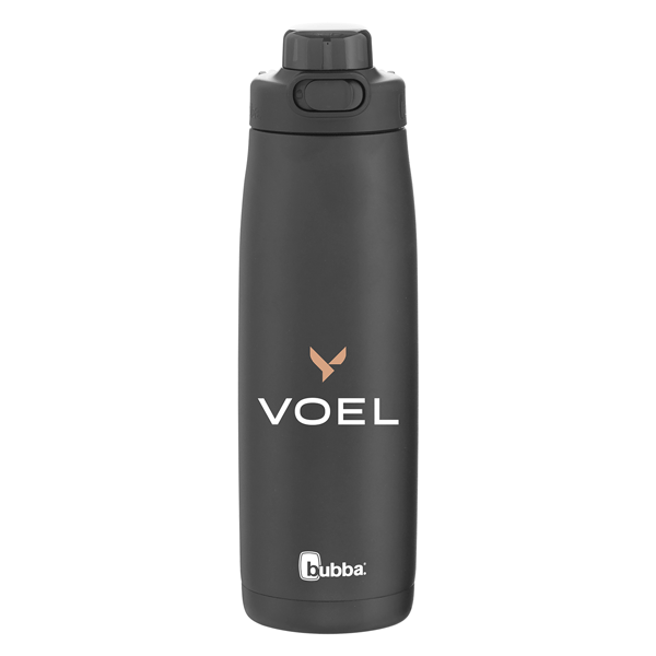 24 oz double wall stainless steel thermal bottle with vacuum insulation, threaded lid, spout shield, one-touch push-button with locking mechanism, carrying handle, and powder coated finish.