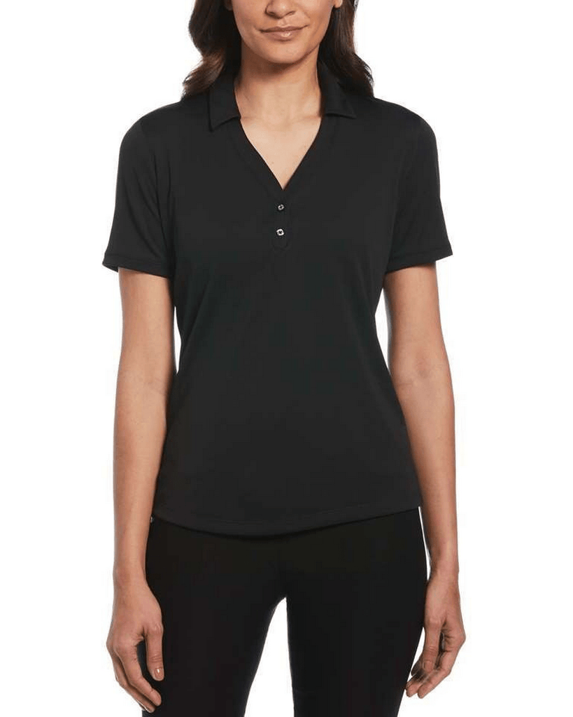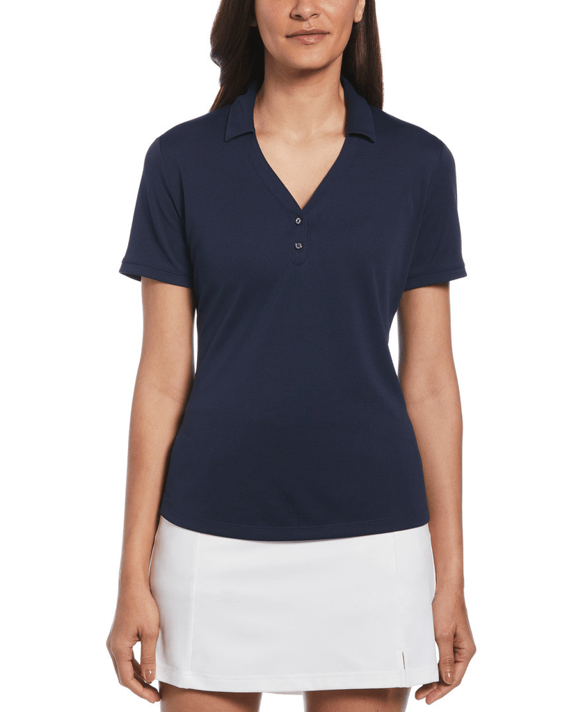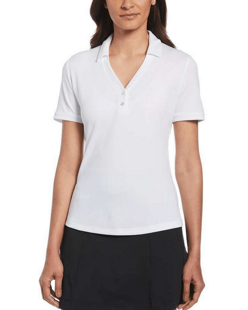 4.8 OZ. 100% polyester. Opti-Dri technology transfers moisture away from the body to keep you cool and dry. Ventilated fabric allows air to flow freely through the fabric to keep you comfortable. Sun protection micro textured fabric. Self fabric collar with open V. 2 button placket with Callaway embossed buttons. Double needle rounded hemmed bottom with side vents. Heat seal label provides tag-free comfort. Contrast embroidered Chevron on back neck.