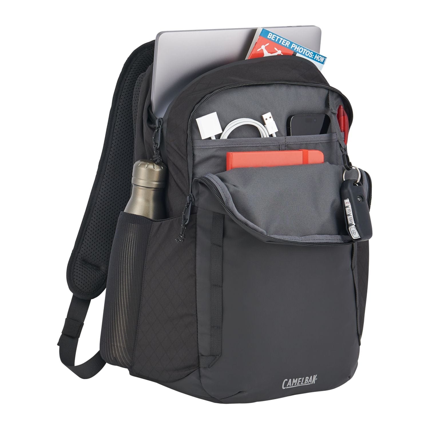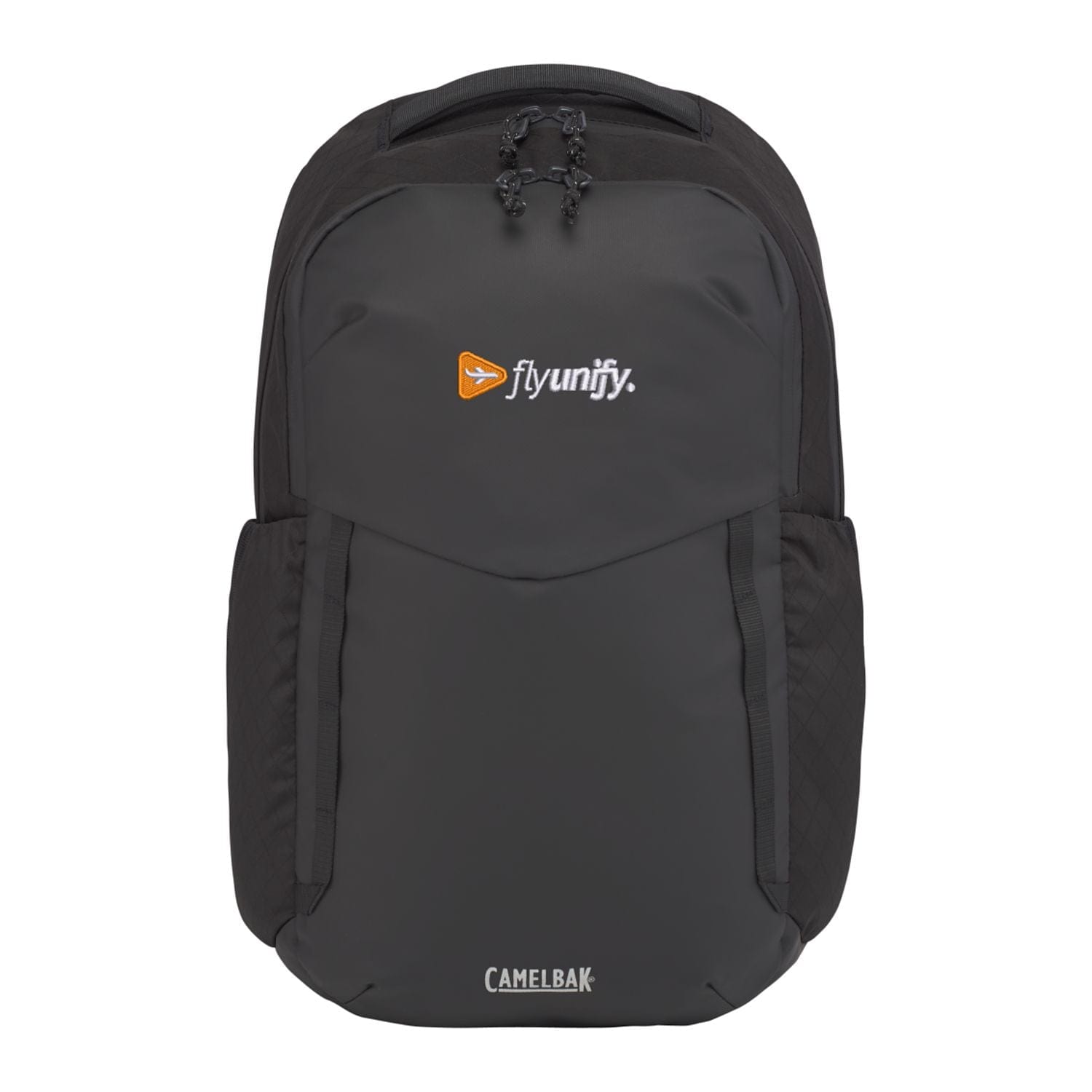 The CamelBak DEN 15" Laptop Backpack is made from coated RPET polyester. A front zippered pocket offers organization and extra storage for quick access. The main compartment includes a 15” padded laptop sleeve. There are two side pockets for water bottles or extra gear. Trolley strap attaches to your luggage or use the padded, adjustable shoulder pads to carry this bag. Through a partnership with 1% For The Planet, one percent of sales of all EcoSmart® products are donated to environmental nonprofits.