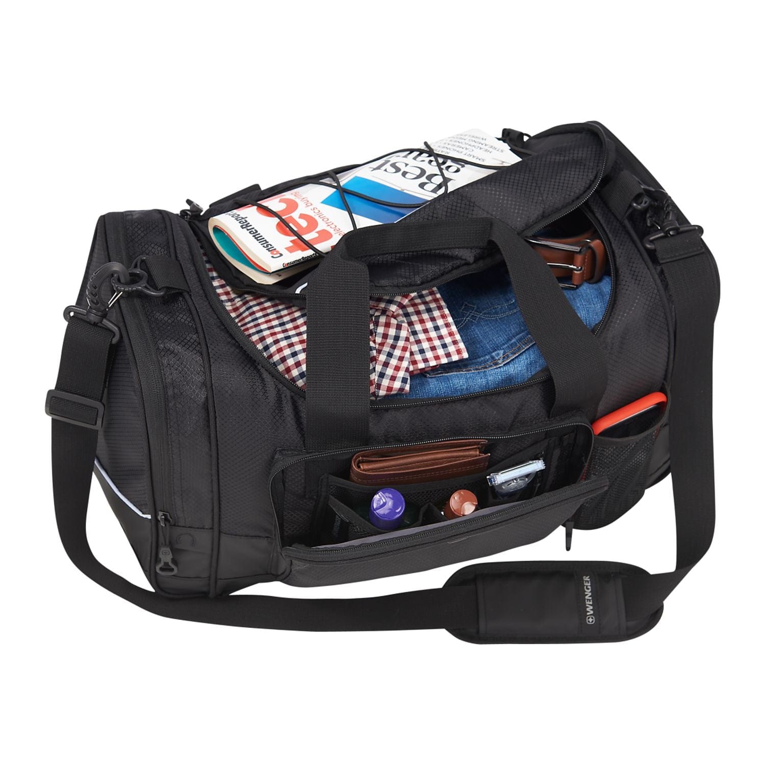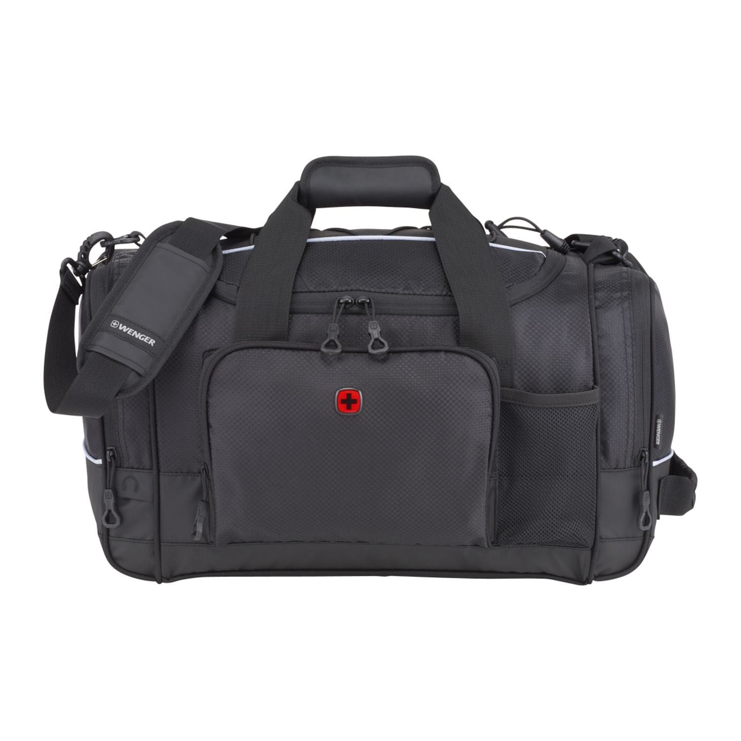 The Wenger Apex 20" RPET Sport Duffel is rugged enough for all of life's adventures, not to mention super roomy! This durable duffel bag features a spacious main compartment, plus two large zip pockets, a front pocket and a mesh water bottle pocket. Perfect for carrying your workout clothes, travel gear, toiletries and more. A front organizer zip pocket is ideal for keys, smartphone, ID, pens, and pencils while a bungee-cord system can cinch an extra pair of shoes and other equipment.