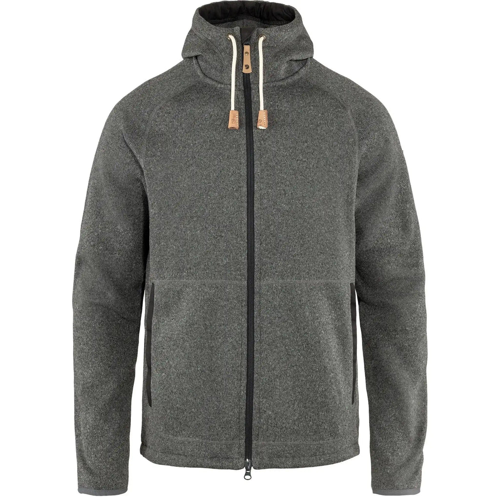 Warm and cosy fleece jacket with a knitted exterior and a soft brushed inside. Perfect as an insulating mid layer under a shell jacket on autumn or winter adventures, and just as comfortable for long afternoons with a good book in front of the fire. It has a fixed hood with a drawcord adjustment and the zipper at the front has a protective flap in G-1000 original that protects the chin. The elbows, hem, pockets and inside of the edge of the hood also have G-1000 for extra durability. Two spacious pockets with zippers. Elastic binding at the sleeve cuffs and drawcord adjustment at the hem. The fleece and mesh lining in the pockets are made from recycled polyester and produced using an environmentally friendly process that both spins and dyes the fibres at the same time. This leads to much lower levels of water and energy consumption compared to traditional dyeing techniques.