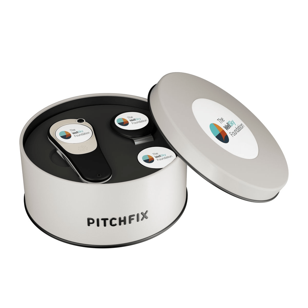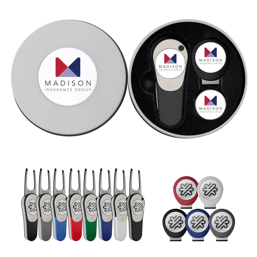 Pricing includes divot tool packaged in Deluxe Grey Round Tin with imprinted lid, Pitchfix Hat Clip, and an extra full color ball marker. Perfect for golf tournament sponsorships, giveaways, and outing gifts.
