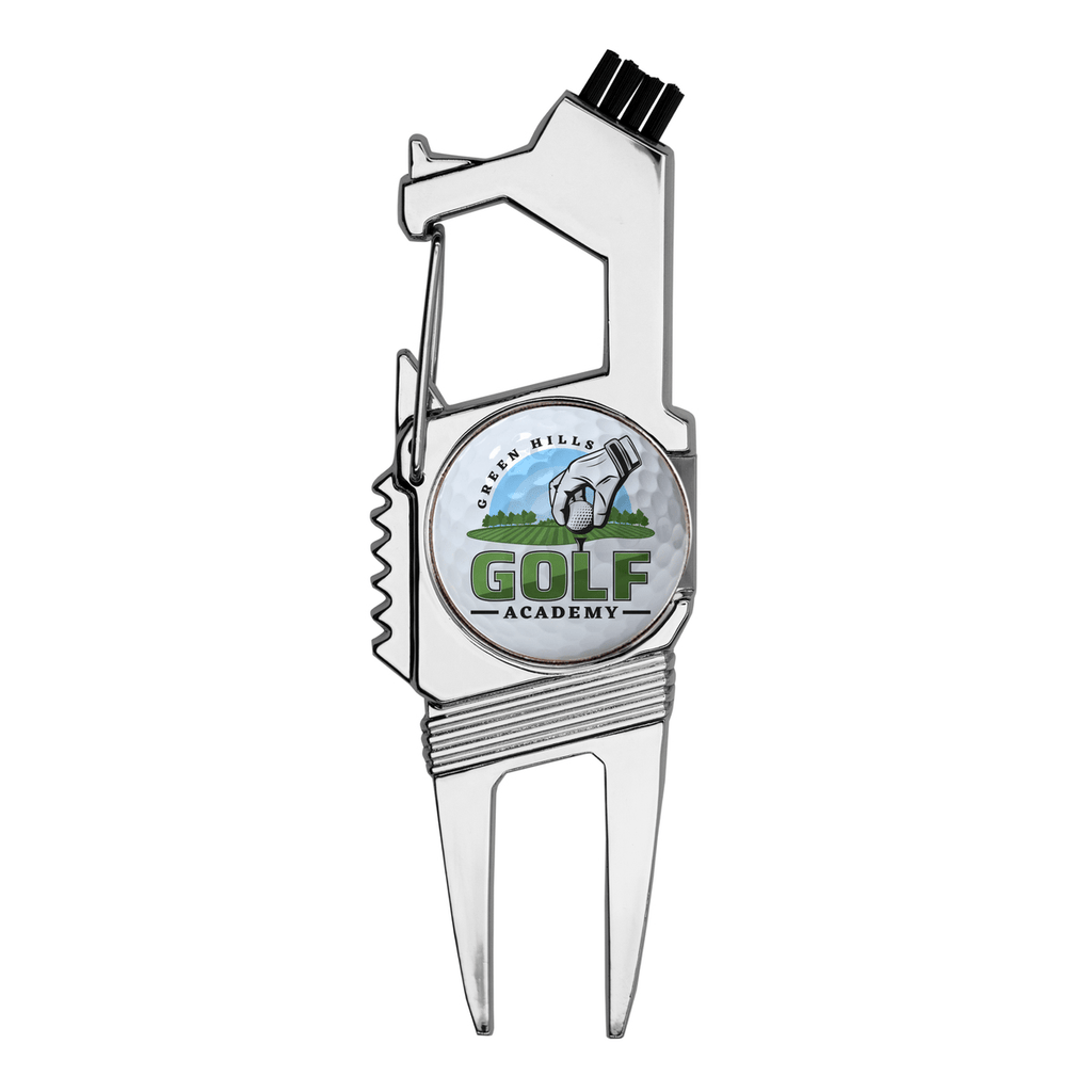This all-in-one multi-function golf tool features a textured grip, belt clip with bottle opener, integrated golf club rest, golf club groove cleaner and fine particle brush. The Golf n' Brew also includes 1" removable ball marker with full color poly dome imprint.