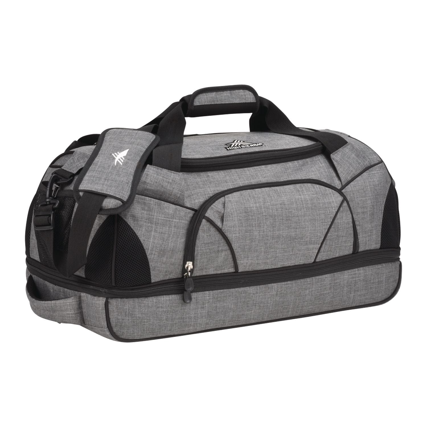 The High Sierra Crunk Cross Sport Duffel Bag includes a zippered main compartment with U-shaped opening and front pocket with deluxe organizer and headphone port. This sports duffel features a wet compartment with a zippered divider panel to create a large compartment to store sportswear and accessories. The High Sierra Cross Crunk Sport Duffel includes a water bottle pocket, accessory pockets.