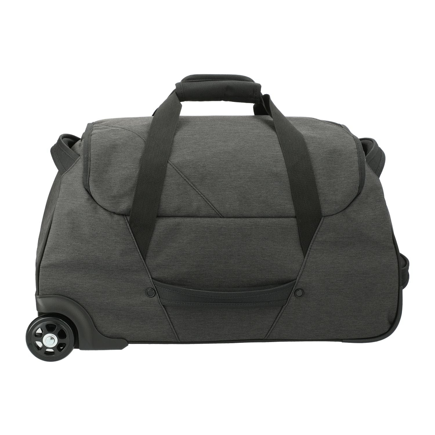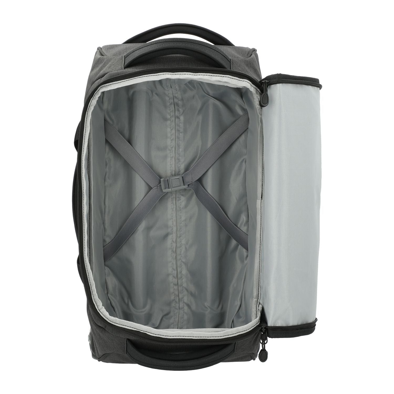 The High Sierra Forester RPET 22" Wheeled Duffel is designed for all casual travel needs. This wheeled duffel features a roomy single compartment design with large U-shaped opening for easy access. Carry using the padded grab handles or the trolley handle. Secure your items with the interior cross straps or in the quick access front and side stash pockets. Made from water resistant fabric and featuring a wipe clean interior, this wheeled duffel makes a great travel companion.