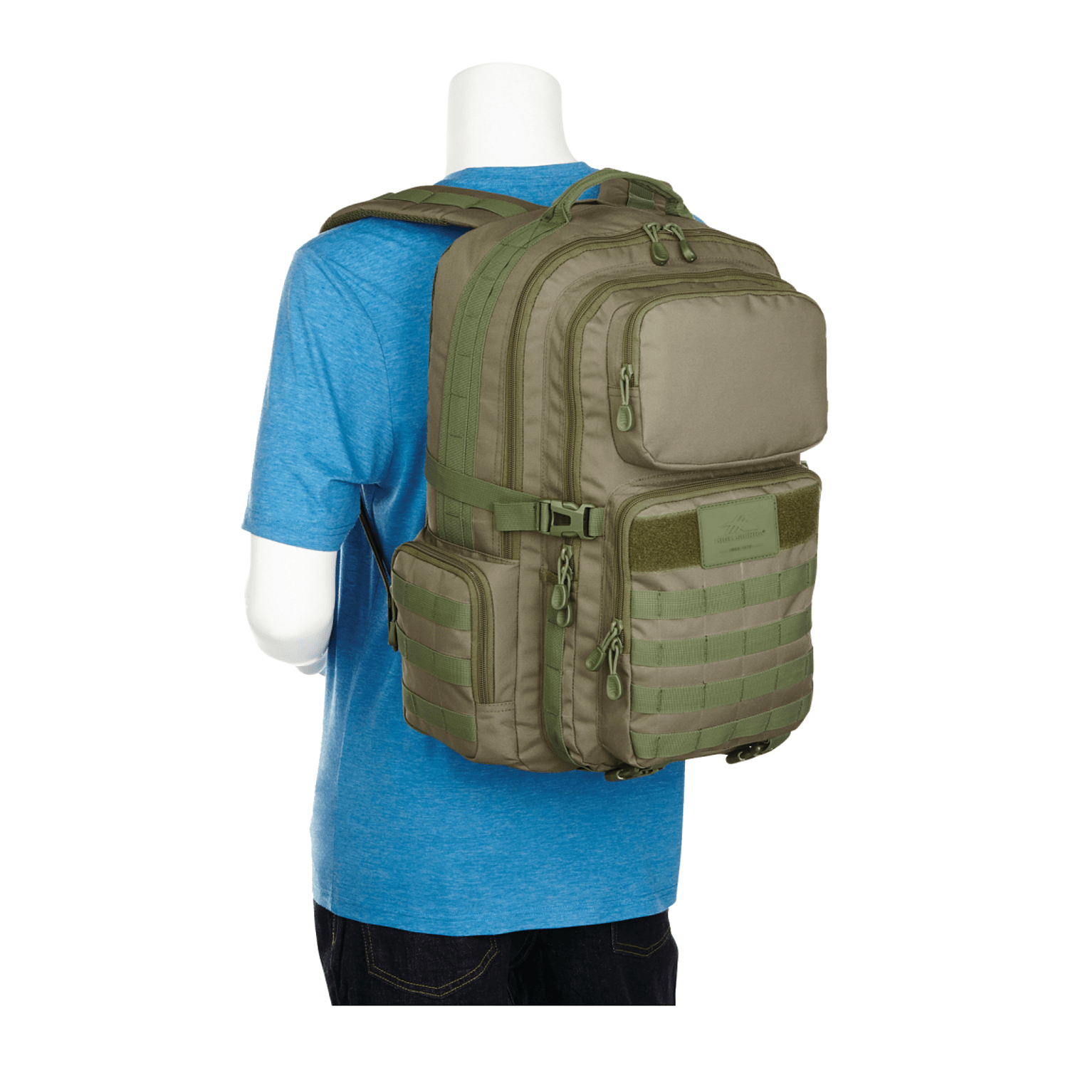 The High Sierra Tactical 15" Computer Pack features a zippered main compartment that fits most laptops measuring up to 15". It also includes a zippered compartment for additional storage, plus two front zippered pockets with a built-in organizational panel and key fob. For added convenience, you can hang your carabiners and other essentials from the tactical straps that run along the bag's front and side gussets. Compression straps located on the side and bottom of the backpack allow you to decrease its depth, ideal for storage and small spaces.