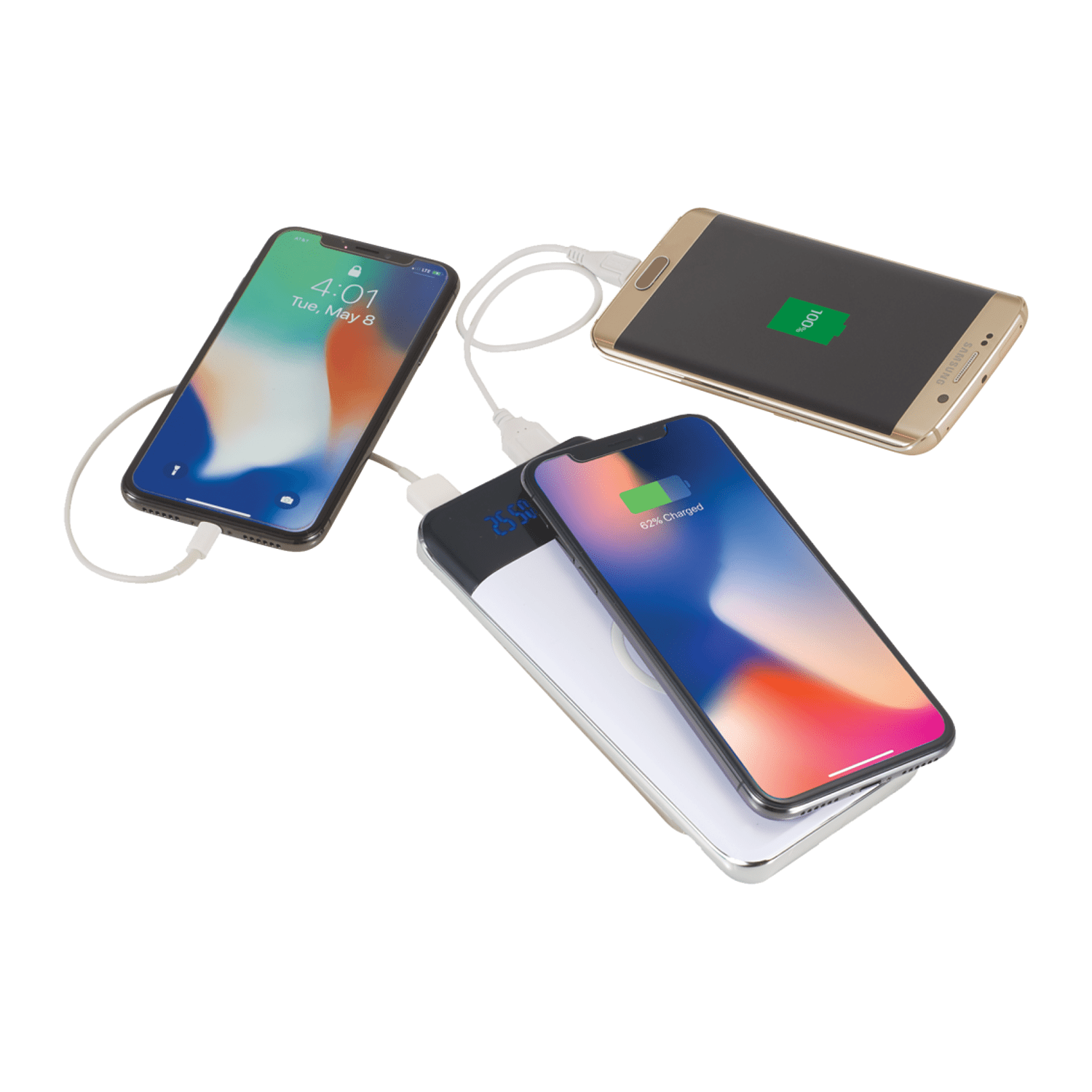 The Constant 10000 mAh Wireless Power Bank contains a rechargeable lithium polymer battery that can work as both a charging pad or power bank. The device features an LED display to show the remaining battery capacity percentage. The Constant Wireless Power Bank supports wireless charging for a variety of devices and can be used to charge any smartphone or tablet that does not have wireless technology through its normal power bank capabilities. It works with most plastic phone cases or covers on. Please charge power bank before initial use.