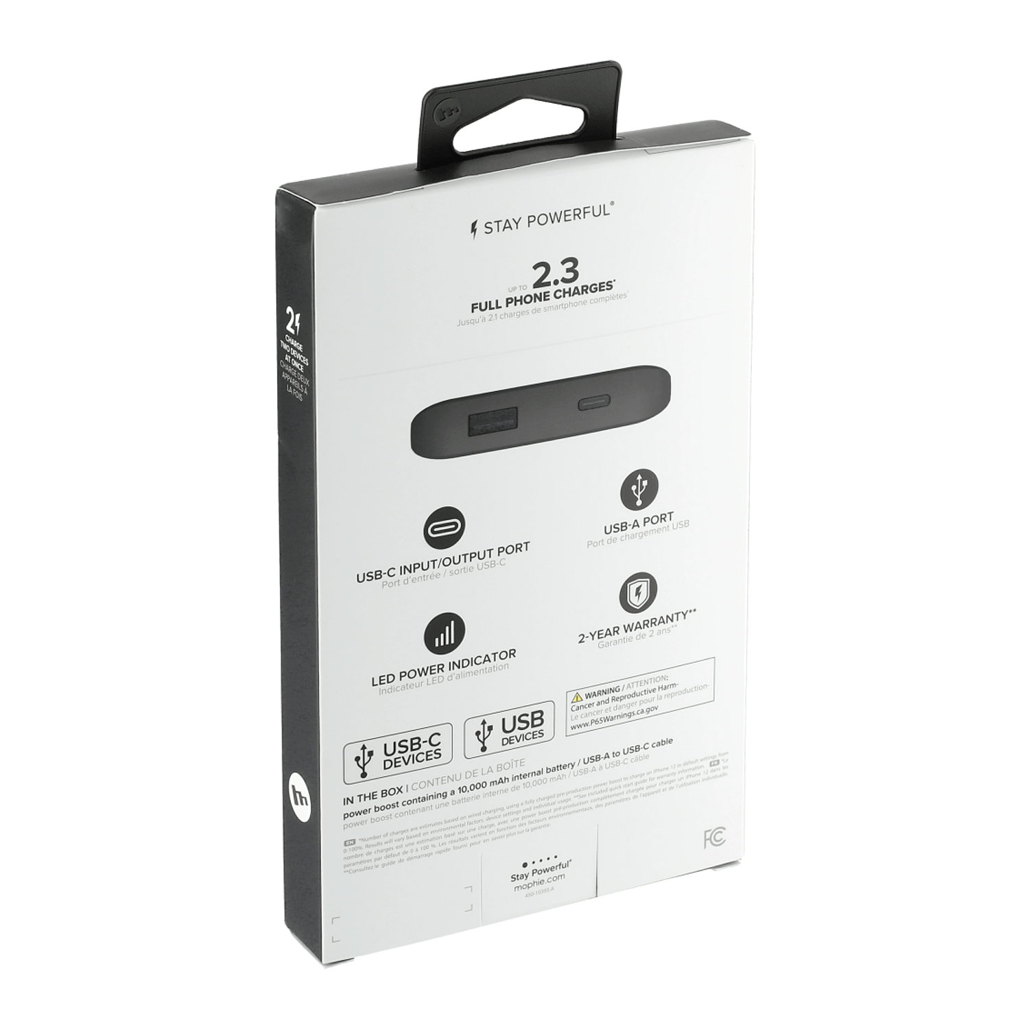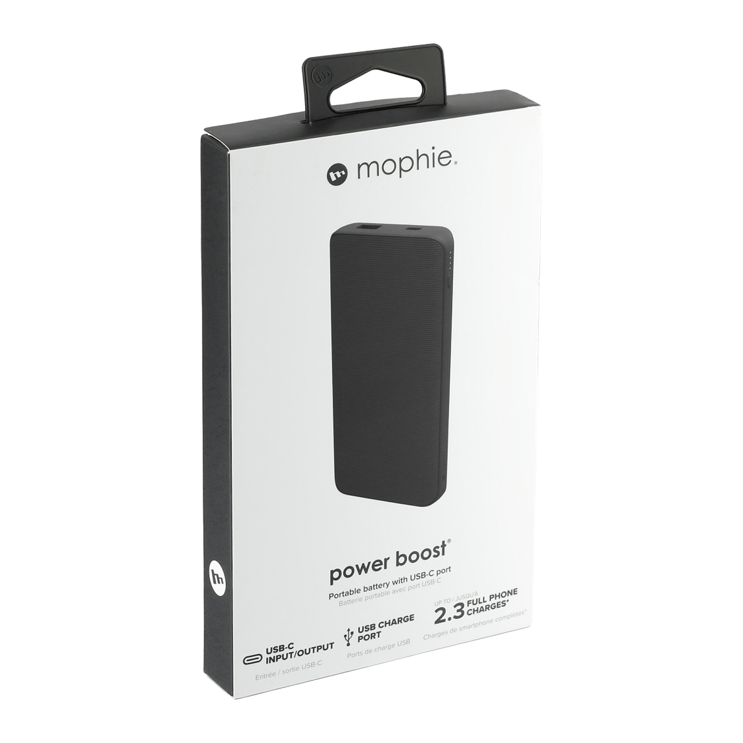 The mophie® Power Boost 10,000 mAh Power Bank has a rechargeable lithium polymer battery that can charge two electronic devices at the same time with one Type-C and one USB-A output ports. Included USB-A-to-Type-C cable. Packaged in a premium gift box.