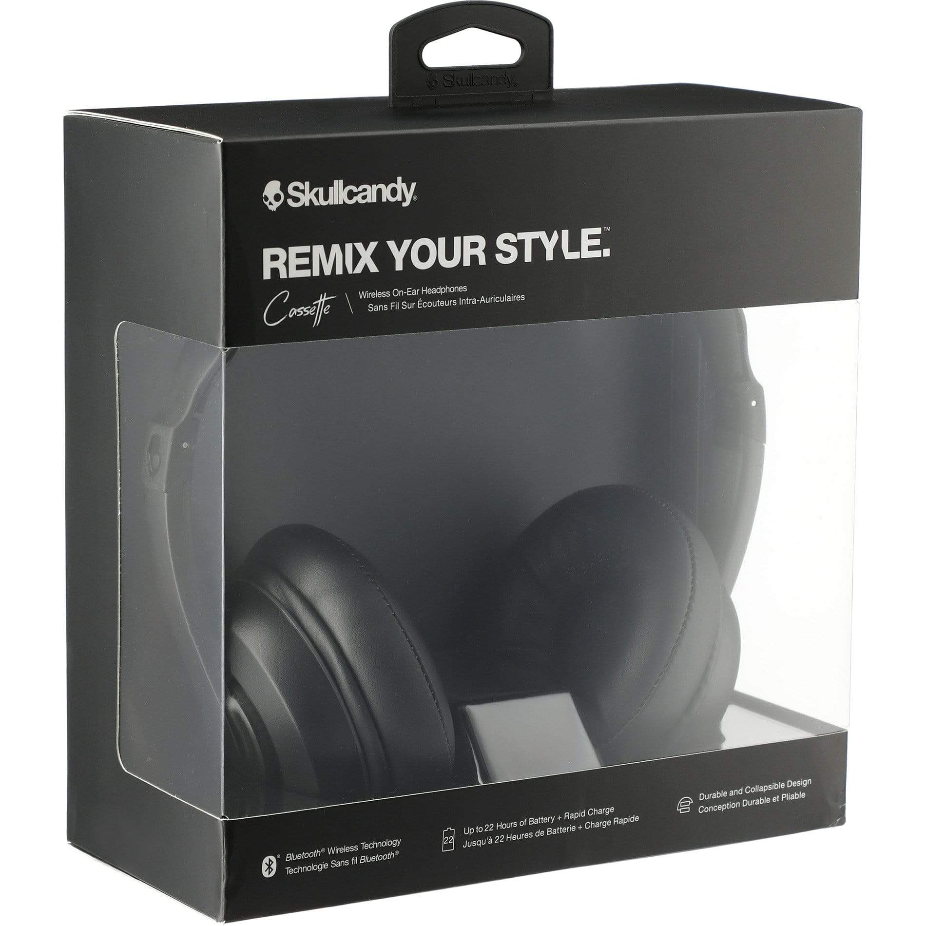 The Skullcandy Cassette On-Ear Bluetooth Headphones feature over twenty two hours of playback time! When the Cassette Bluetooth Headphones are not in use, they can be charged in 10 minutes to provide two and half hours of playback time. The Cassette Bluetooth Headphones feature built in music controls to control to volume, track, answer/reject calls. The collapsible design and plush on ear cushions make the Cassette perfect for any travel. Included is a Micro USB Charging Cable and 3.5mm Aux Cable.