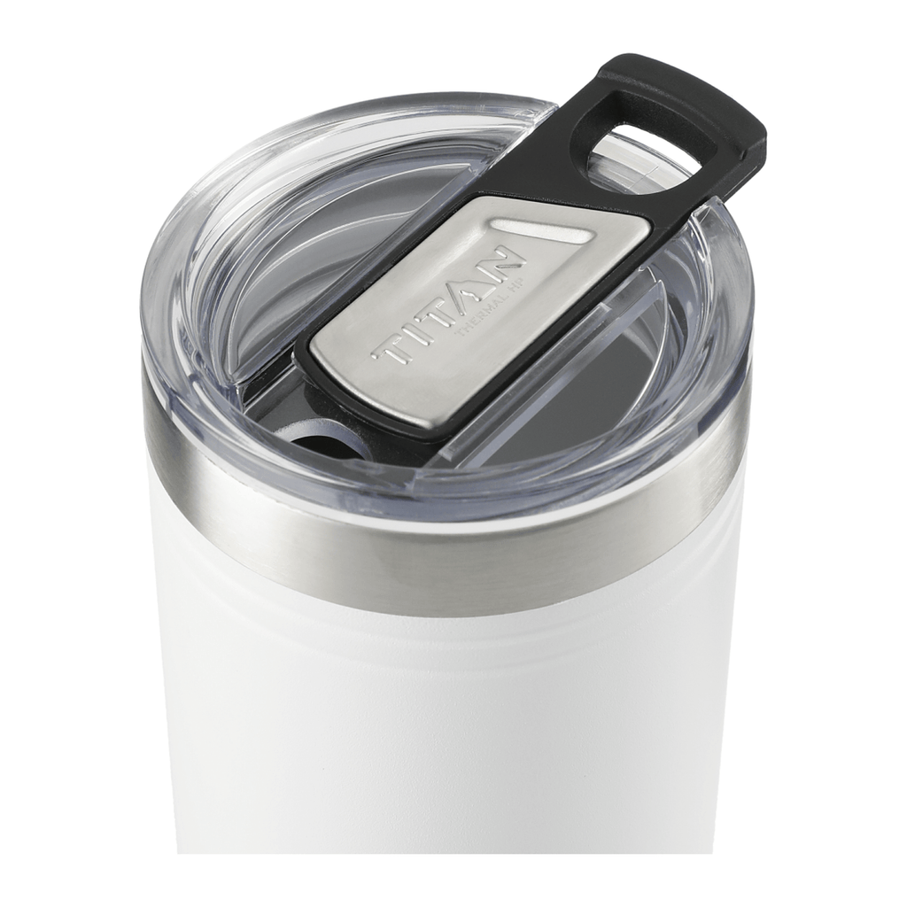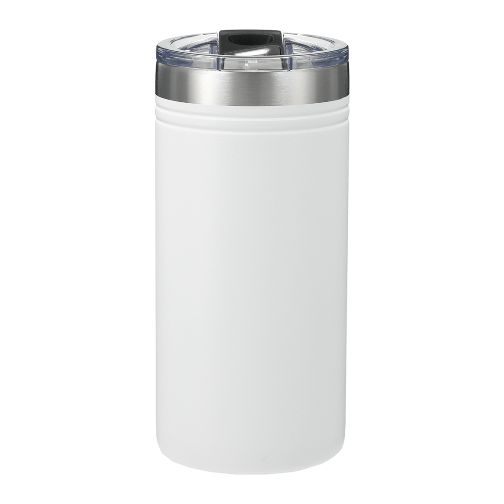 Enjoy a beverage by drinking through the push-on lid with slide closure, or place a slim can inside the tumbler. You choose! Durable, double-wall stainless steel vacuum construction with copper insulation, which allows your beverage to stay cold for 24 hours and hot for at least 8 hours. The construction also prevents condensation on the outside of the tumbler. On-trend, durable powder coating. Wide opening for comfortable filling and pouring. 12oz.
