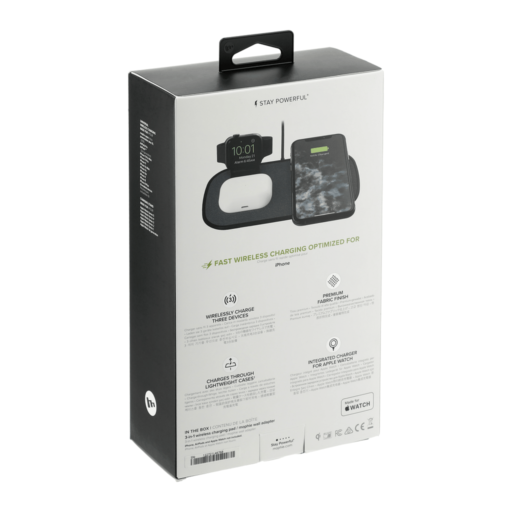 The mophie® 3-in-1 Fabric Wireless Charging Pad is designed with dedicated charging spots for smartphones, Apple Watches and Airpods/Airpod Pros. It delivers up to 7.5W of power to iPhones or other enabled devices. The built-in Apple Watch charger holds the watch magnetically in place while charging. It works with most plastic phone/airpods cases on. A wall adapter and 9-inch charging cable are included. Packaged in a premium gift box. Qi-certified.
