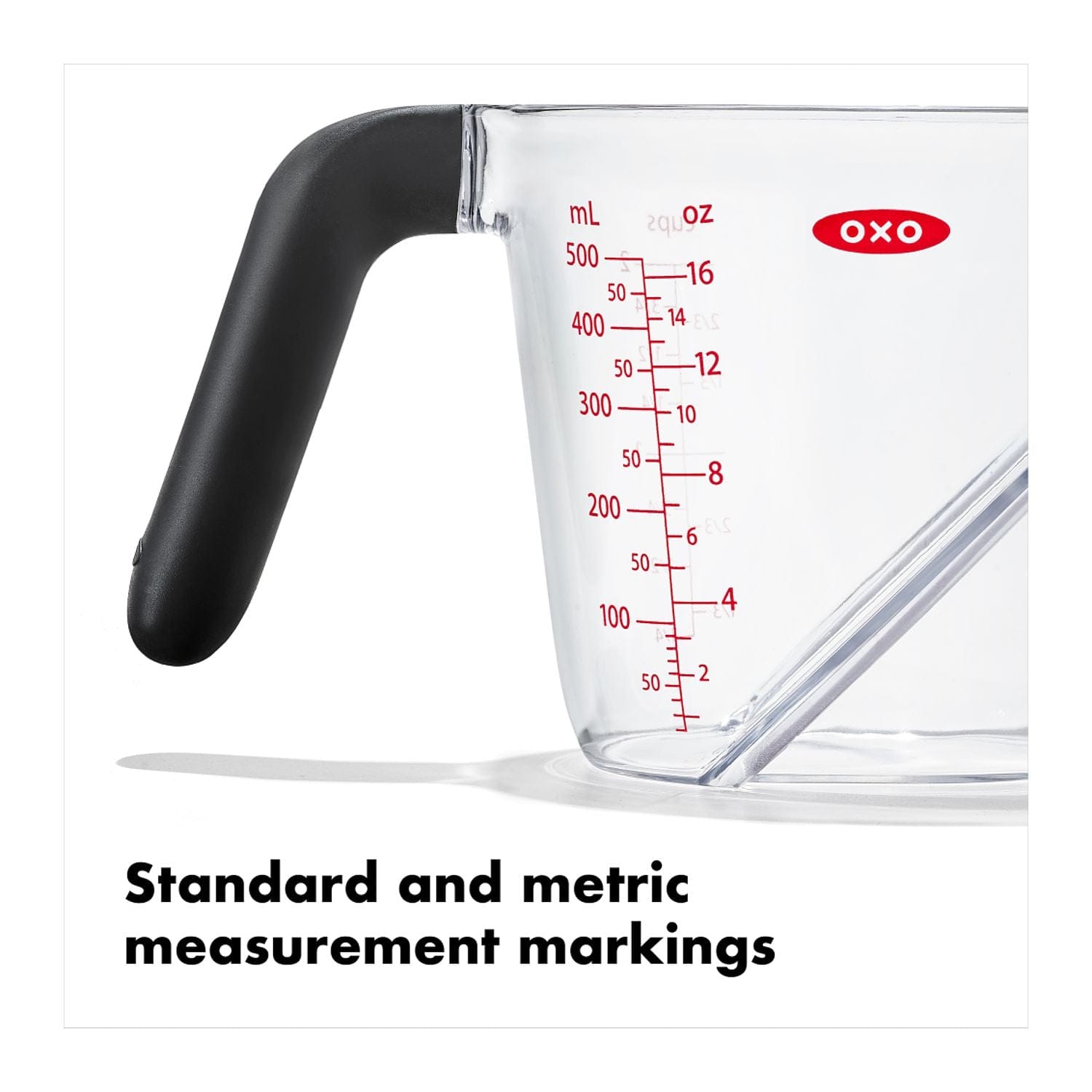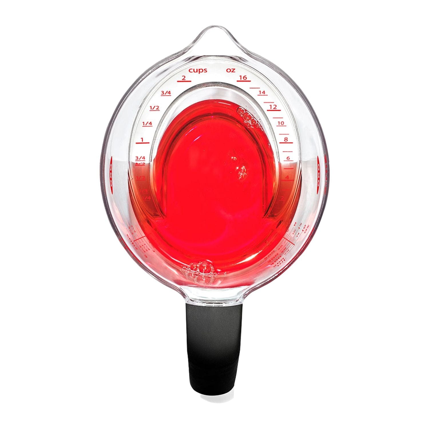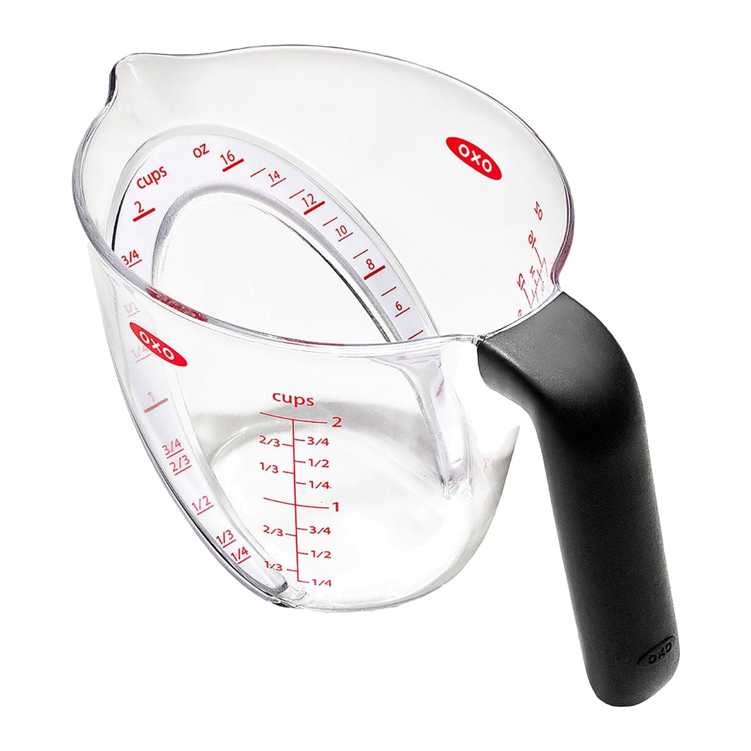 Say goodbye to bending to check your liquid measurements. The OXO Good Grips 2-Cup Angled Measuring Cup makes everything from crafting cocktails to whipping up vinaigrettes easier, thanks to our revolutionary design that allows you to read the measurement by simply looking down into the Cup. This Cup from OXO is a favorite with Good Housekeeping magazine editors because the patented angled surface inside lets you easily read cup, ounce and milliliter markings from above. This lightweight, BPA-free Cup is made of Tritan™ Renew plastic. It has a non-slip handle and a generous spout that let you pour with comfort and control. Also available in Mini, 1-Cup and 4-Cup versions. Handwash Only.