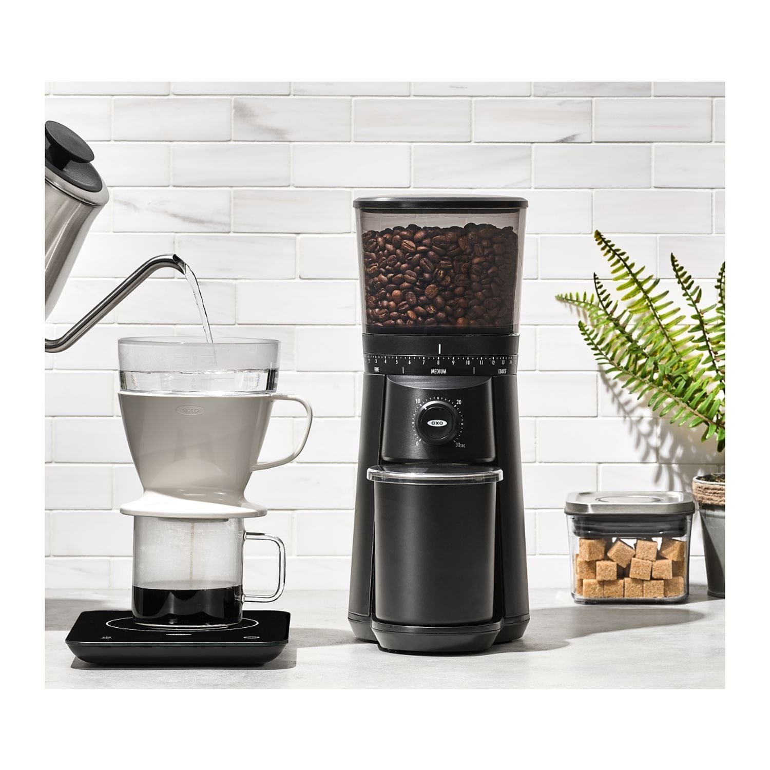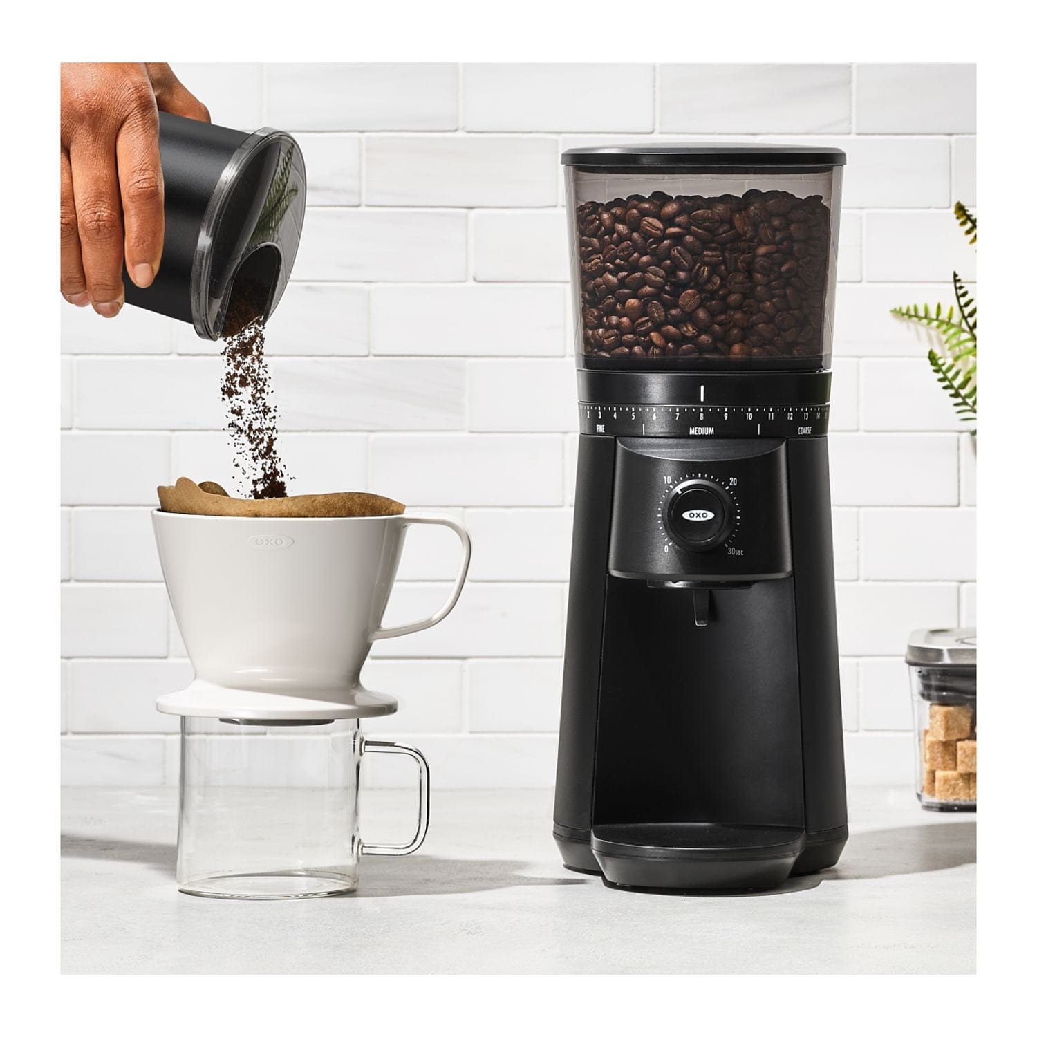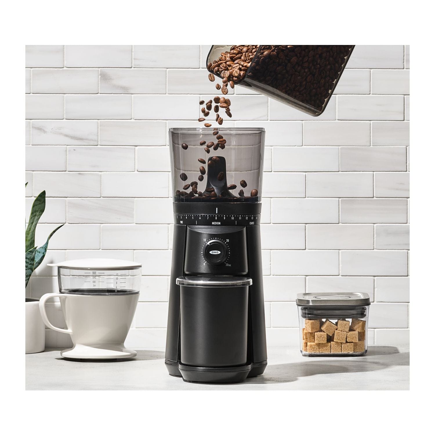 The OXO Conical Burr Coffee Grinder helps your beans unlock their full potential, because the best coffee starts from the grounds up. The design is simple, so nothing stands between you and your first cup. Just add beans and choose from 15 grind size settings – from fine for espresso to coarse for French press – turn the dial to select grinding time, and push to start. Stainless steel conical burrs create uniform grounds, for golden cup standard flavor, and the one-touch timer keeps your last setting, so you don’t have to reset it every time. It has a powerful DC motor that works to preserve the flavor of your beans and won’t overheat them. The matte black finish adds an elevated texture and finish to your kitchen or at-home coffee bar. Non-decorated components are dishwasher safe.