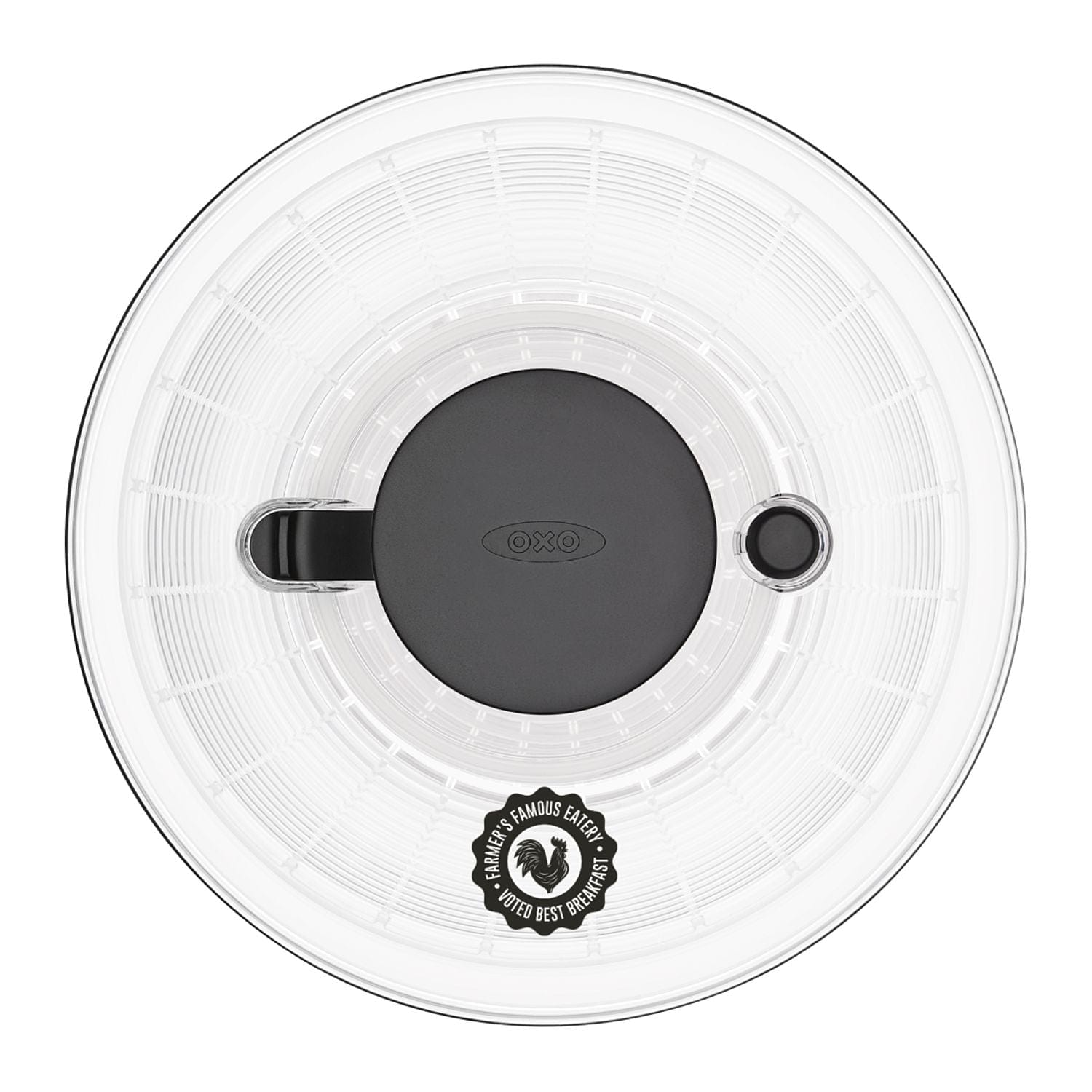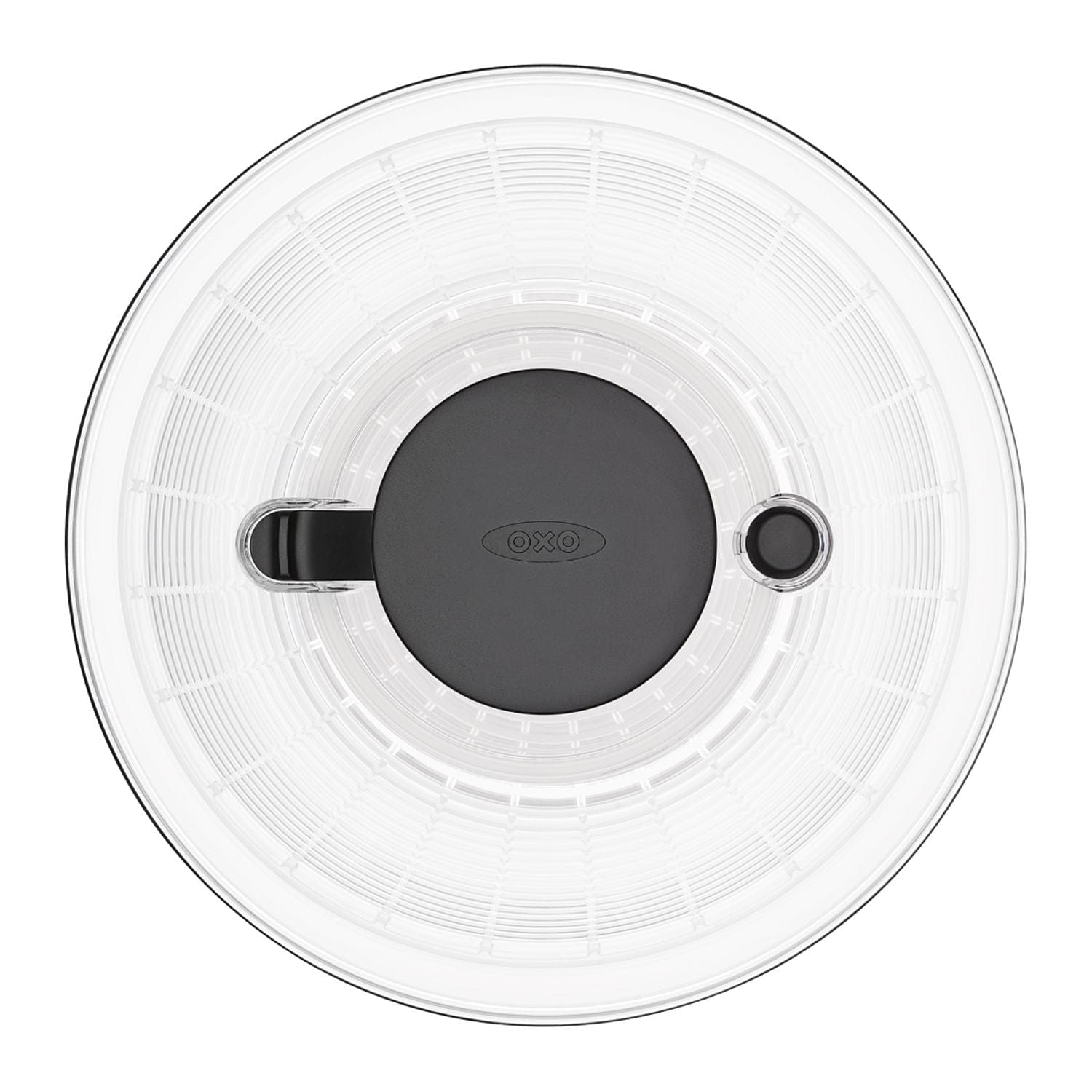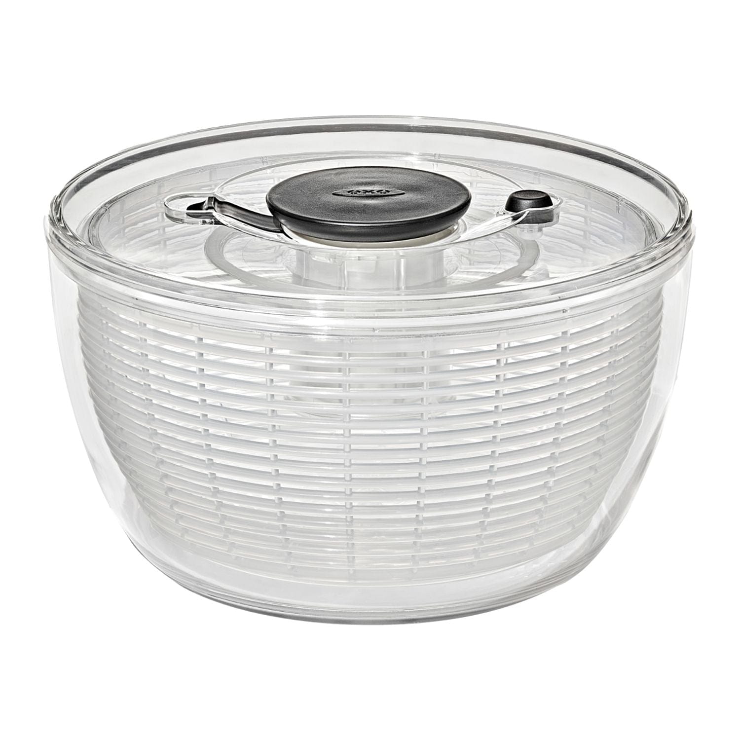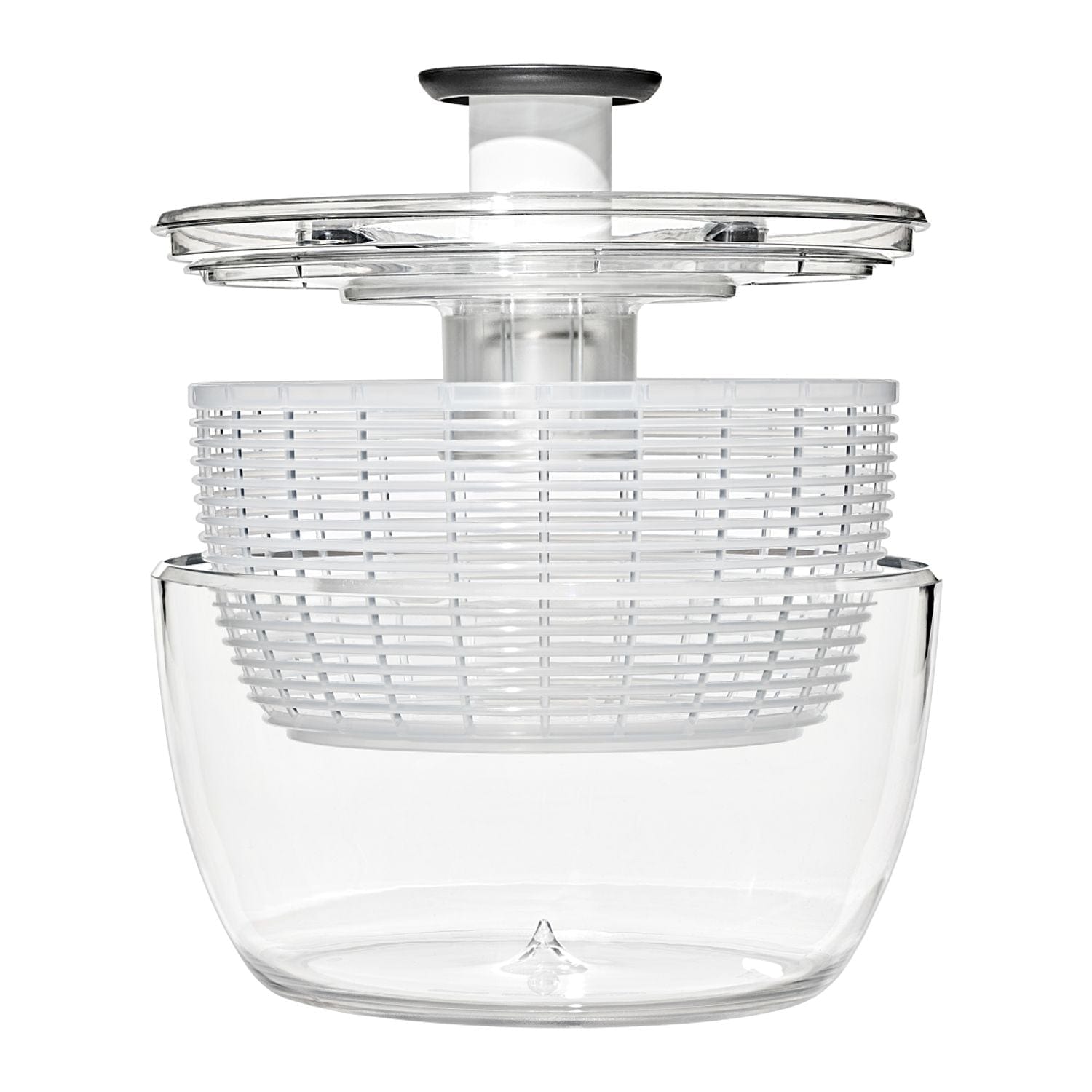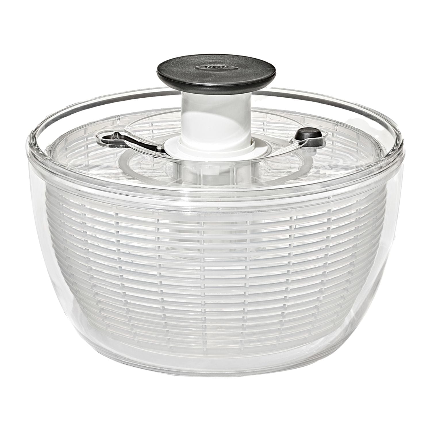 The OXO Good Grips Salad Spinner is the quick and easy way to dry greens or herbs. For clean, dry ingredients, just press the soft, non-slip knob. The spinning basket doubles as a colander, so you can rinse lettuce and more with ease. The non-slip base prevents skidding, and the patented built-in brake button stops the Spinner on a dime for unloading. Toss and serve your salad right in the bowl: The durable dish is crystal clear and moves seamlessly to the table. Simply slide the lock to hold the pump flush with the lid for compact storage. The lid comes apart for thorough cleaning. Bowl capacity is 6.22 qt/5.89 L; basket capacity is 4.95 qt/4.68 L. Non-decorated components are dishwasher safe.