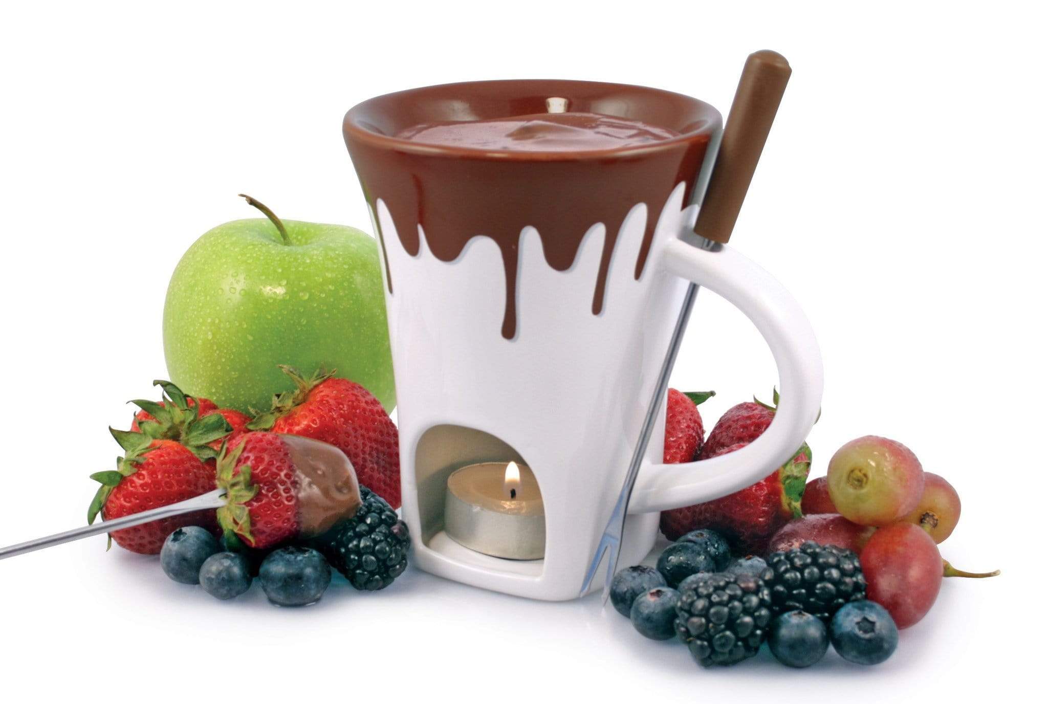 Chocolate fondue was created by a Swiss Chef living in New York in the 1960's, and is the perfect way to stir up a dinner party. It is practically effortless to prepare and your guests can participate and enjoy a fun and delicious chocolate dessert at a relaxed pace. The set includes a Fondue mug, two fondue forks and Tealight candle for low heat flame. Dishwasher, microwave & oven safe.