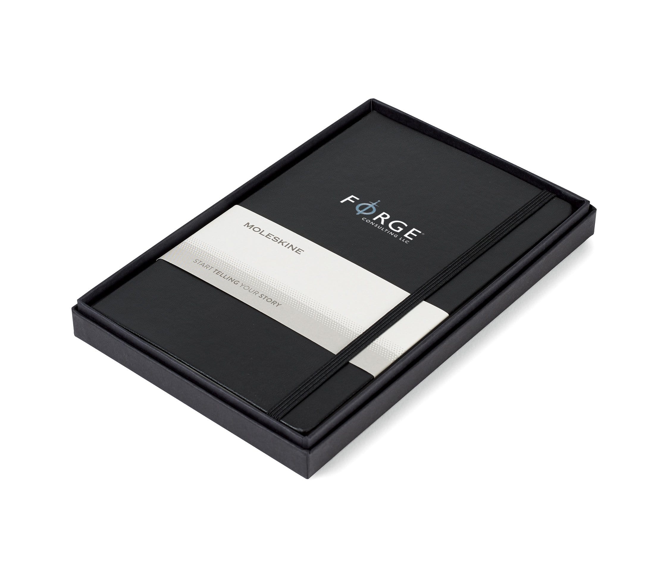 Moleskine® large notebook gift set in a two-piece gift box measuring 5.625" L x 8.625" H x 0.875" W.