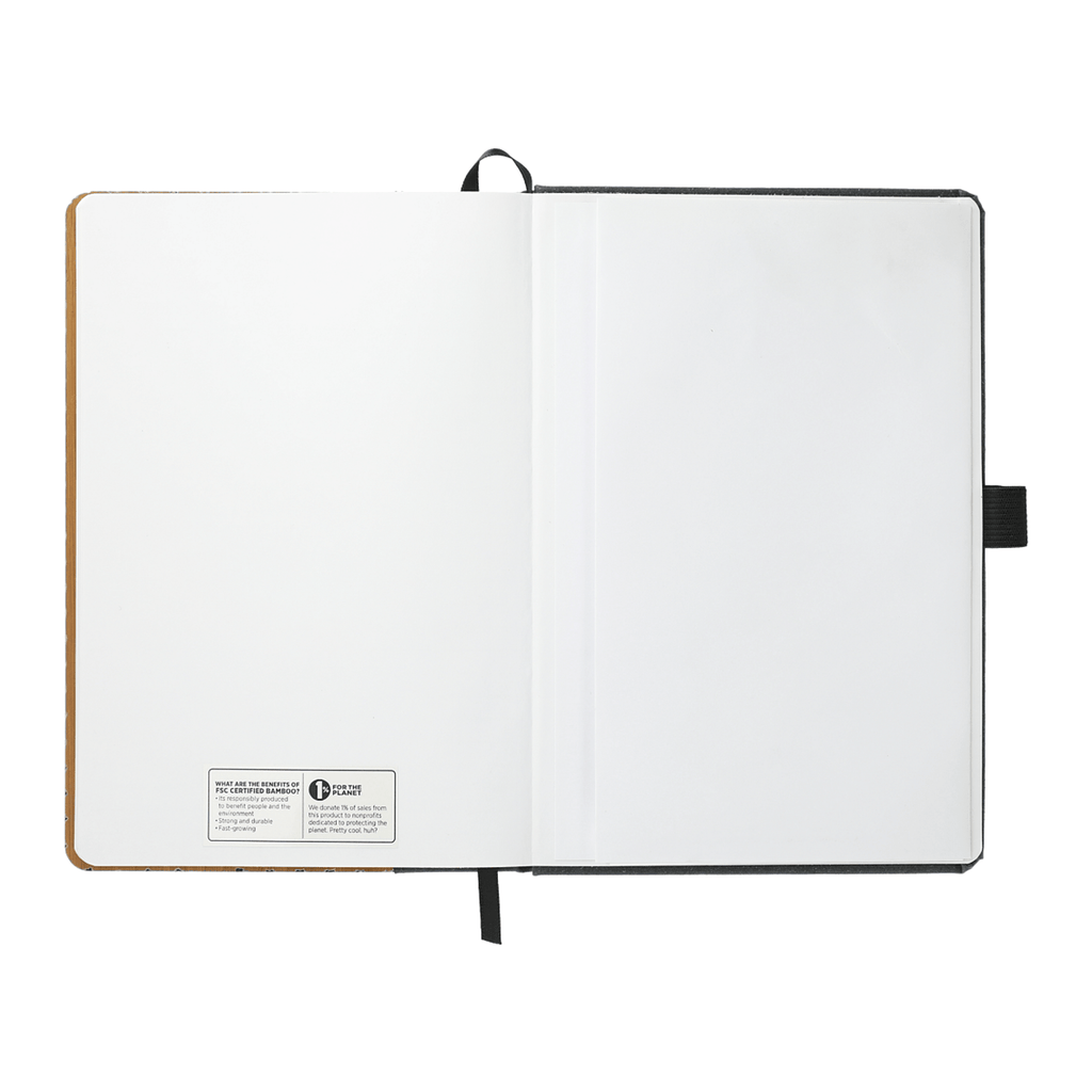 The FSC Bamboo Bound JournalBook features a unique FSC-certified bamboo cover with recycled leather accent. It includes 80 sheets of recycled, white lined paper as well as an elastic closure, ribbon page marker and pen loop. Due to the nature of bamboo material, variations in laser imprinting quality may occur.