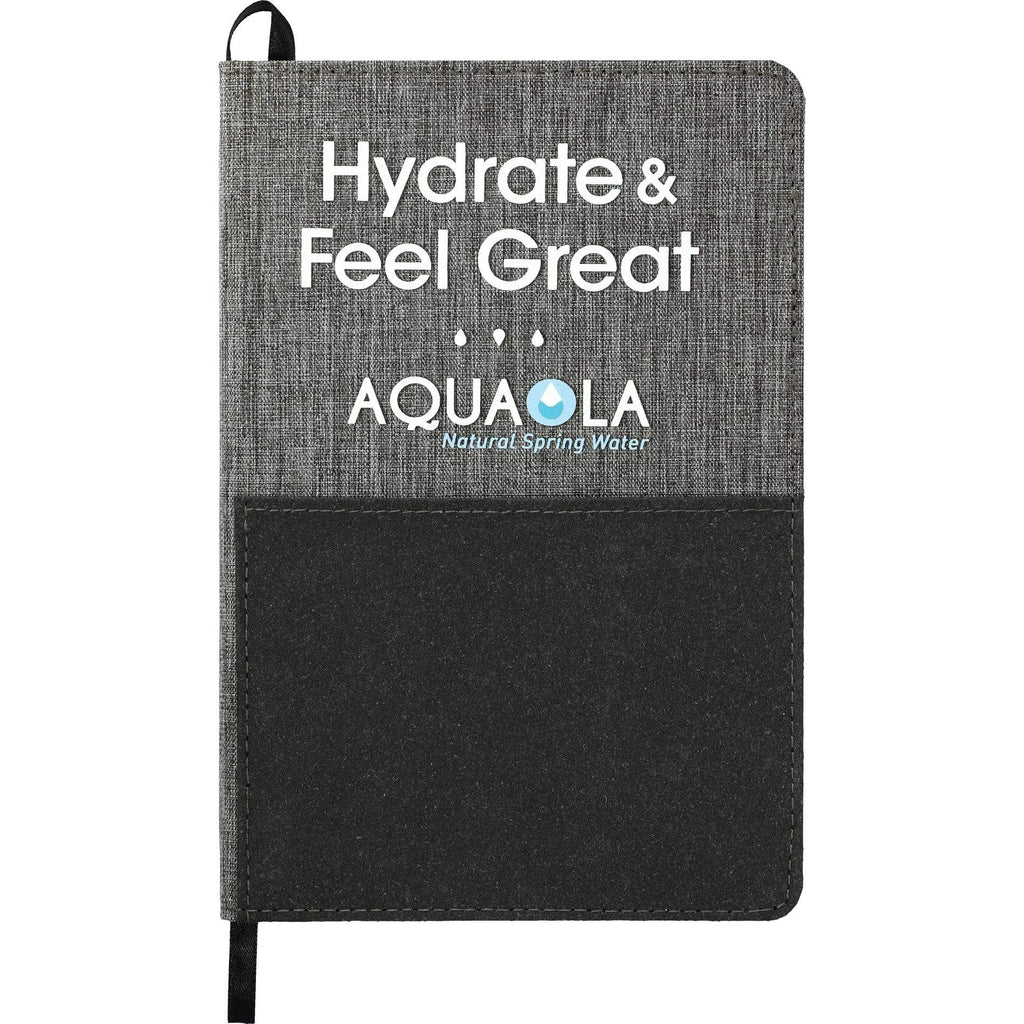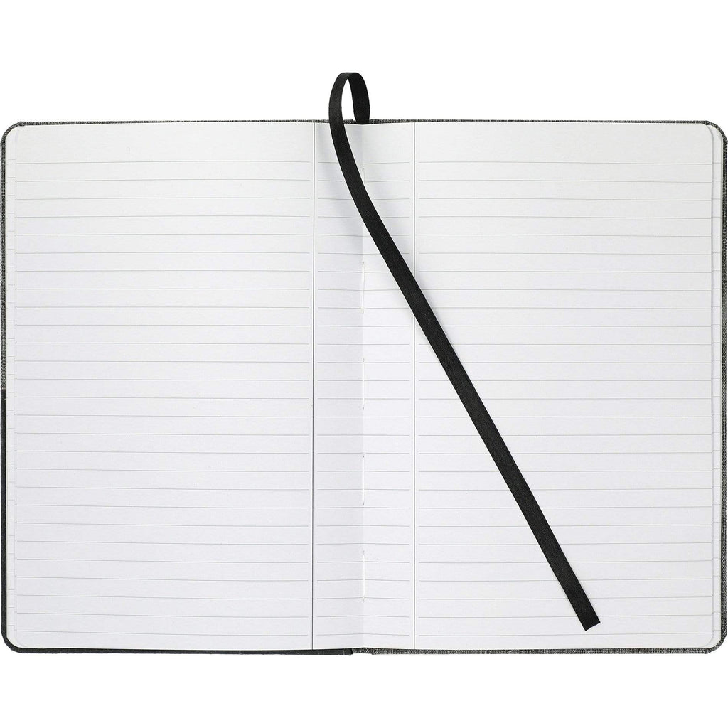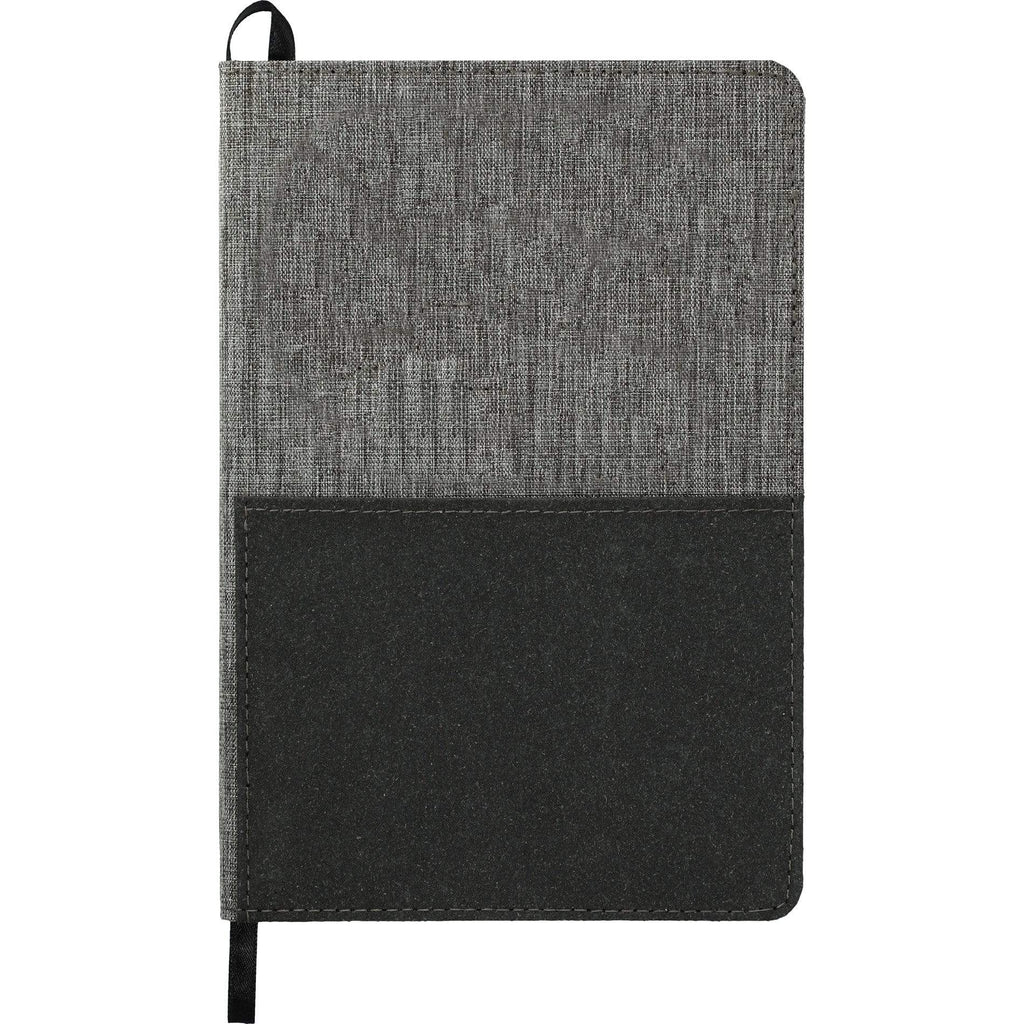 Made of post-consumer recycled fabrics, this bound notebook features a RPET woven cover with recycled leather front pocket for storing documents, smartphone, etc. 80 sheets of recycled paper. Includes back document pocket. This item contains 85% of recycled material.