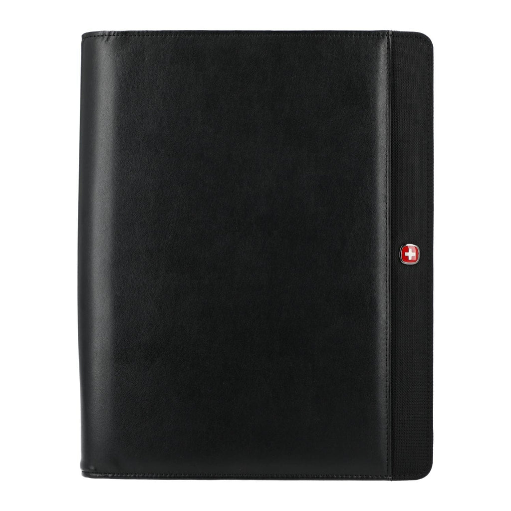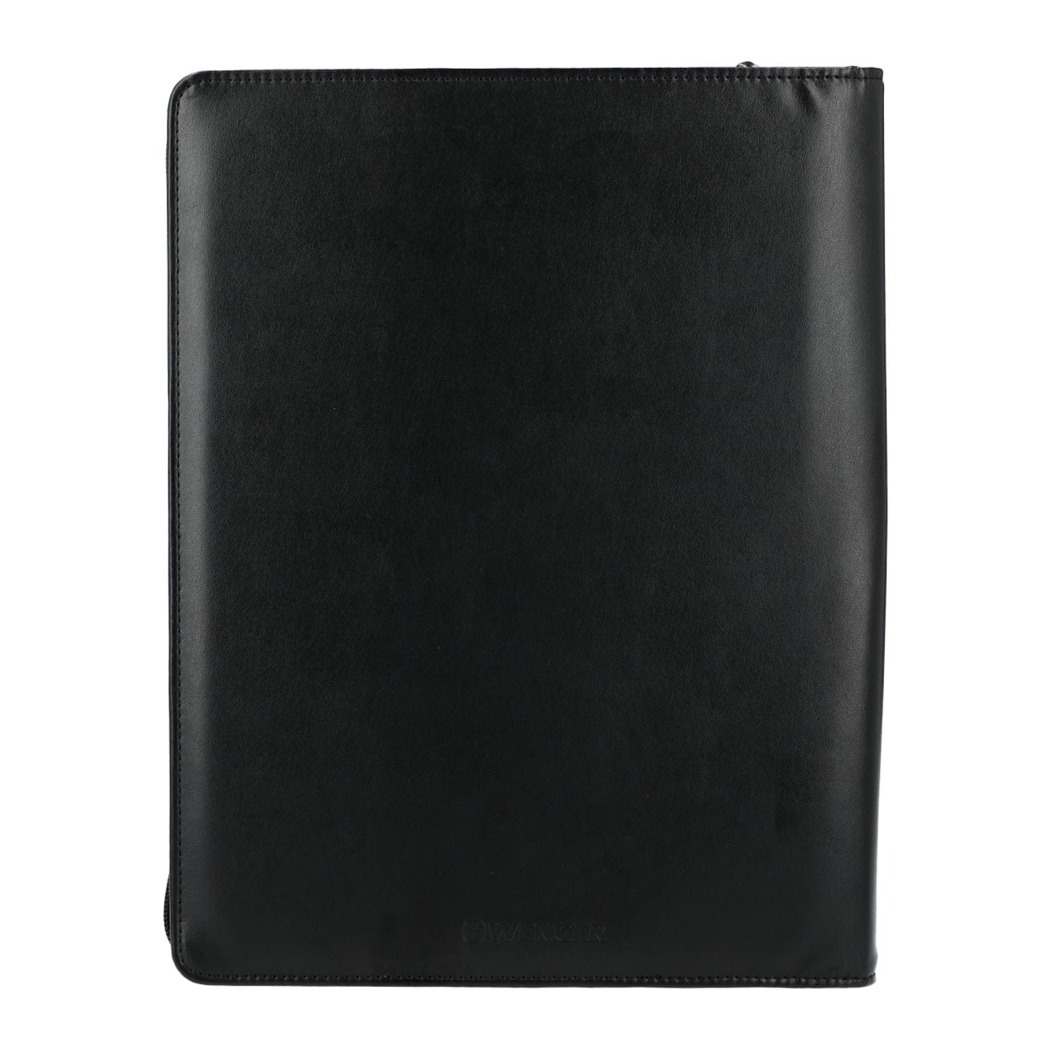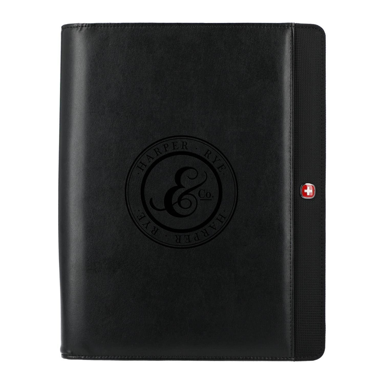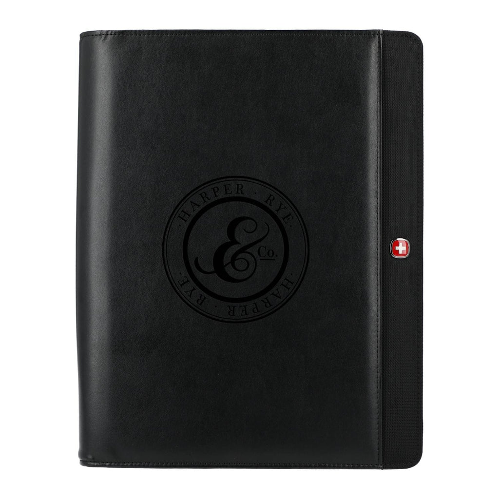 The Wenger Recycled Tech Zippered Padfolio features a recycled PU cover material and 30 pages of white recycled lined paper. Interior includes pockets, business card pockets, elastic loops and pen loop. Includes white recycled gift box.