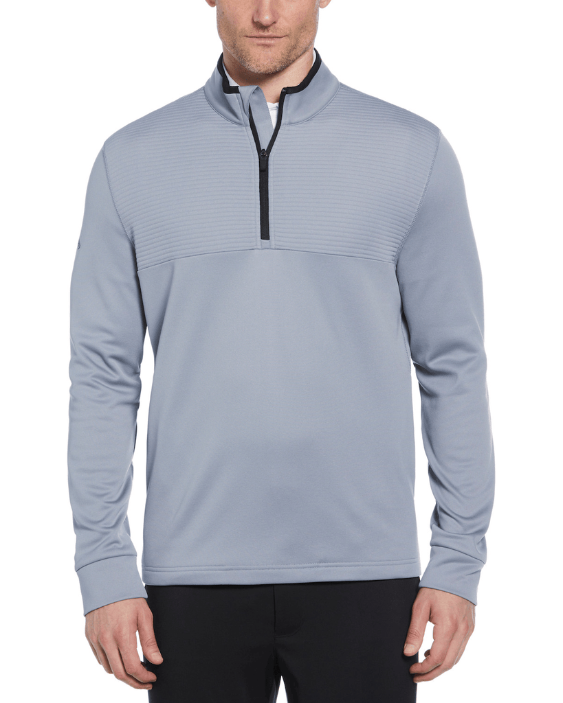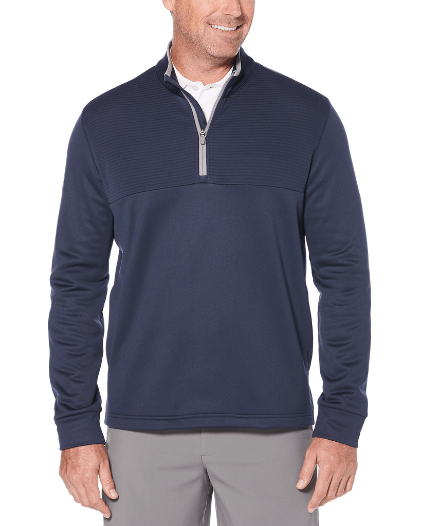 6.6 oz 100% polyester Fleece knit. Thermal fabric provides an extra layer of warm comfort. UV Repel technology keeps skin safe from the sun's harmful rays. UPF 50. Ottoman at center front chest. Mock neck with contrast binding. Reverse coil zipper with Callaway Chevron on pull. 2 ½ inch self fabric cuff. Front open pockets. Heat seal label provides tag-free comfort. Contrast heat seal Callaway Logo on Right Sleeve.