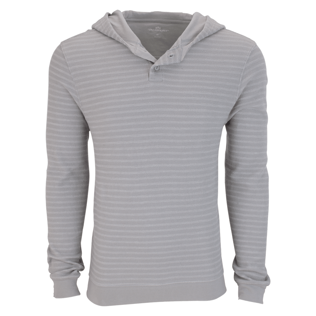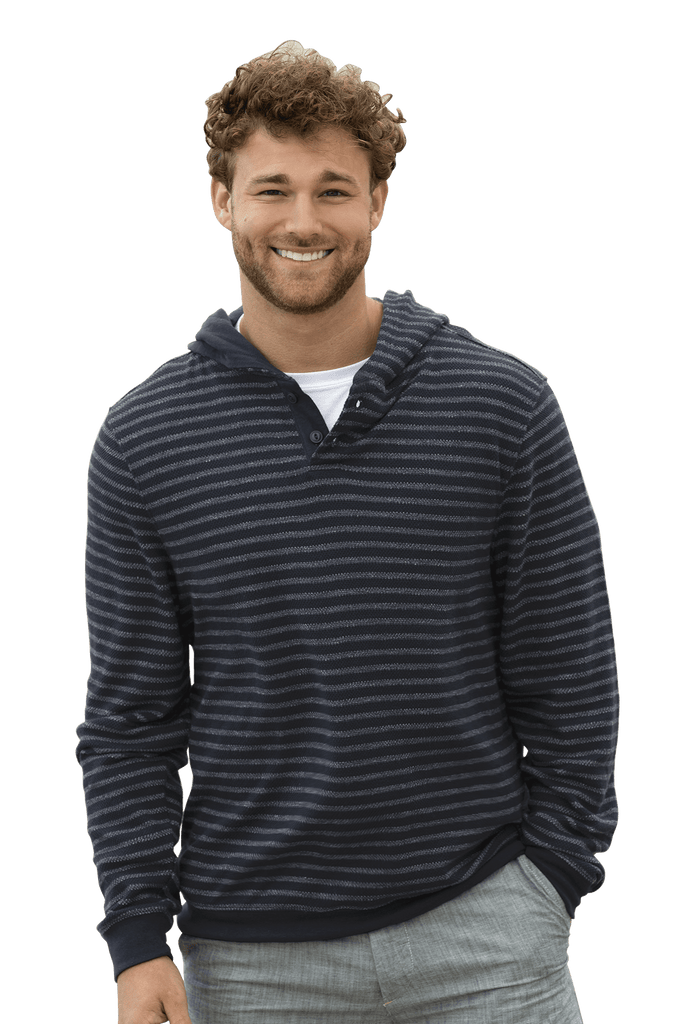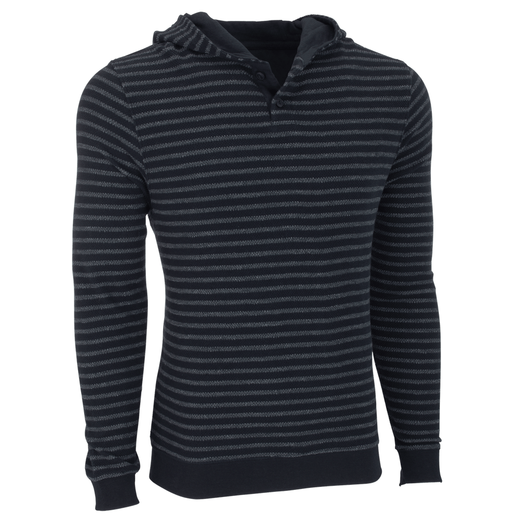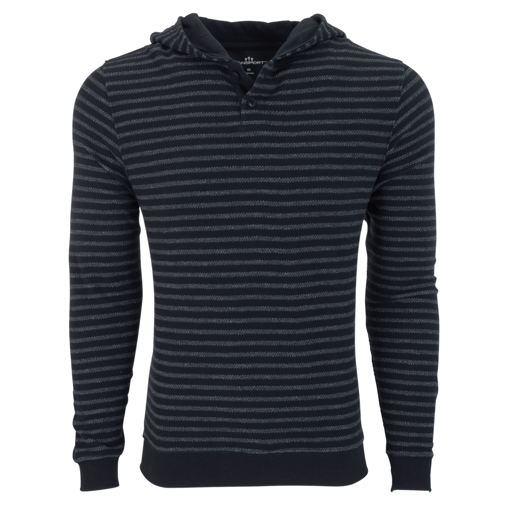 Kick back in a surf-inspired pullover designed to bring out the beach bum in us all. 87% cotton/13% polyester, 7 ½ oz. knit jacquard stripe, two-button placket with solid inner placket, jersey-lined hood, rib cuffs and waistband.