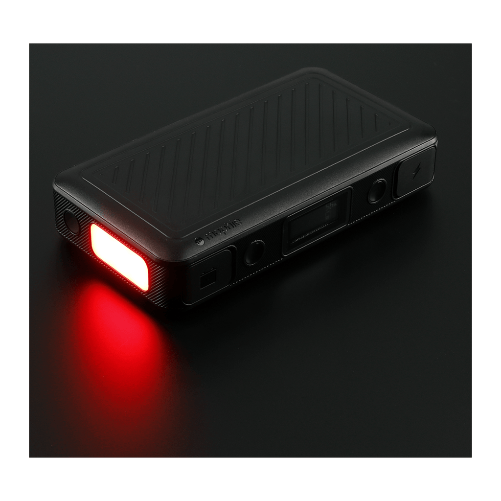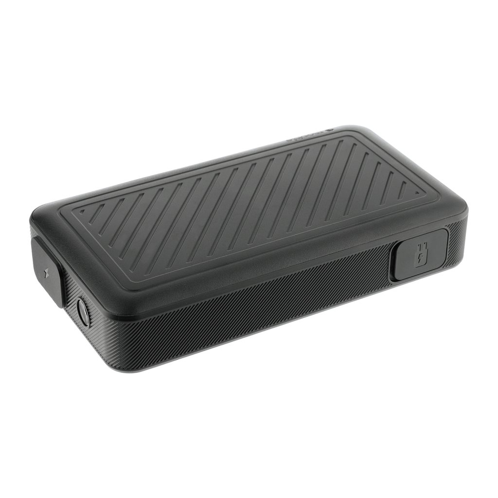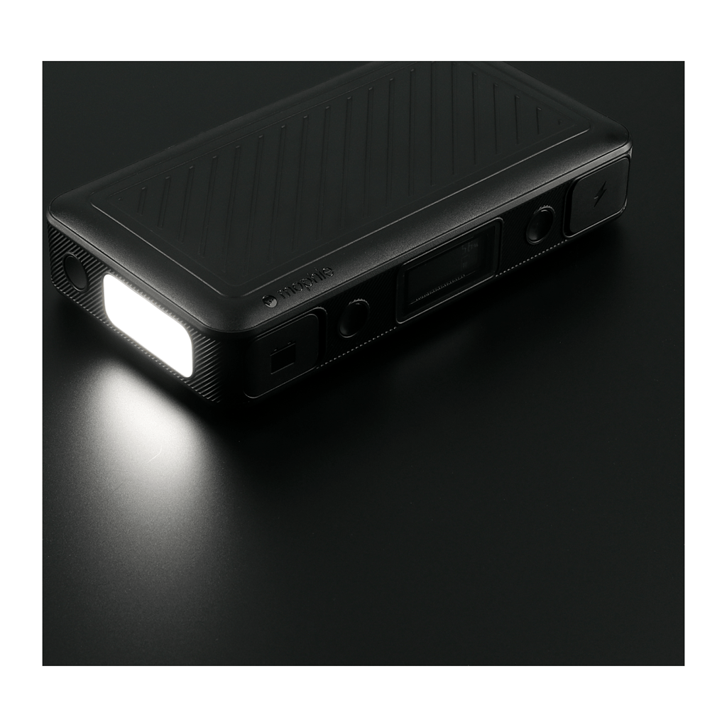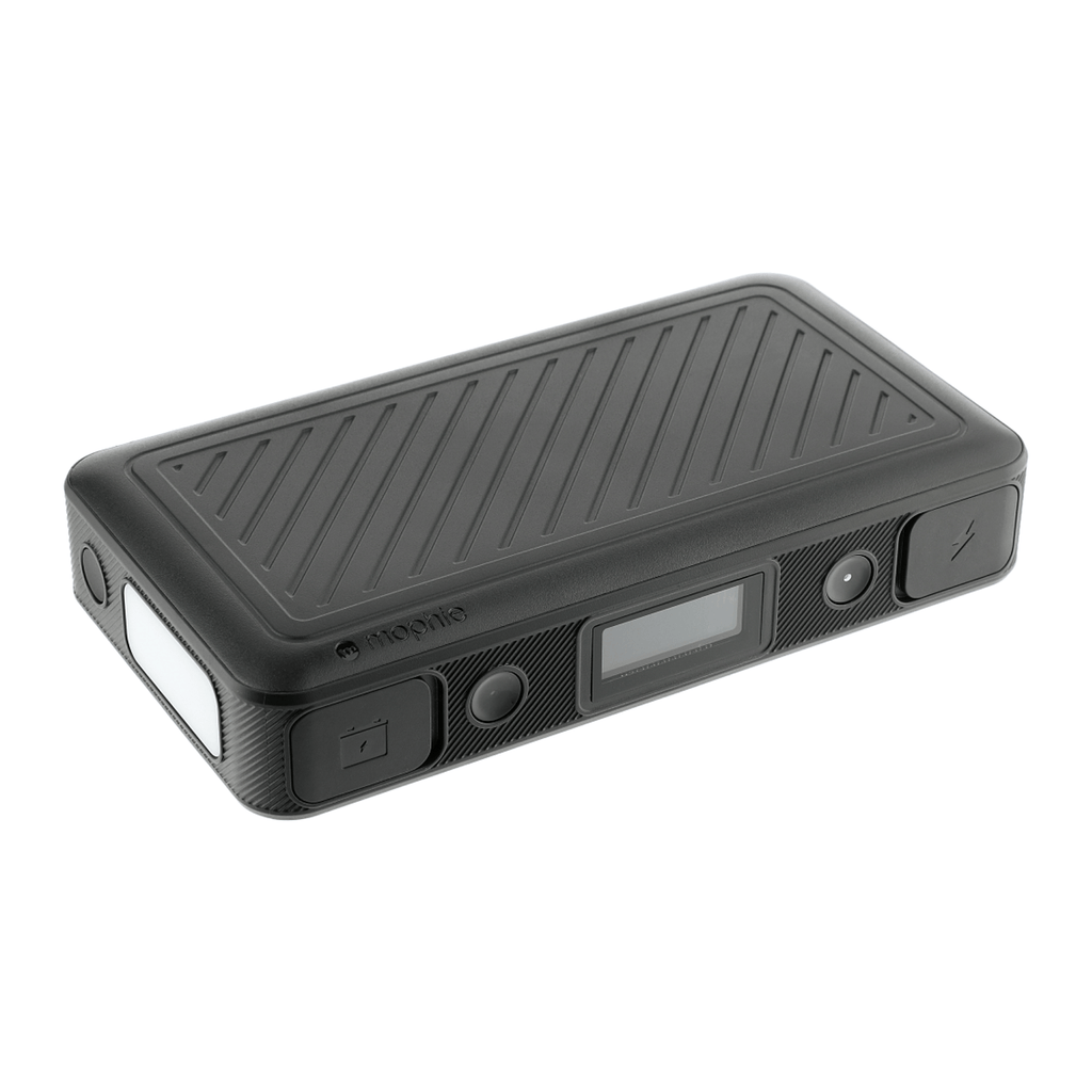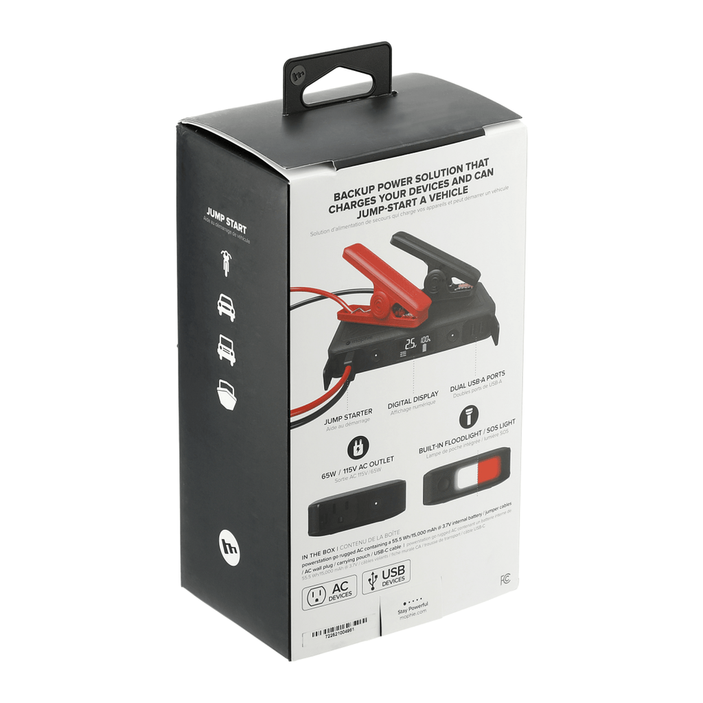 The mophie® Powerstation Go Rugged AC has a 15,000 mAh/55.5Wh rechargeable lithium battery and works as a power bank with dual USB-A outputs, a 65W AC port and a floodlight. It includes jumper cables that can jump start a full-sized truck and 12V vehicle batteries in seconds. It features an LCD display to show remaining battery life and the current voltage. Also includes a UL-listed AC wall plug, carrying pouch and USB-A-to-Type-C cable. Packaged in a premium gift box. Power banks are permitted in carry-on luggage only, and at the discretion of TSA agents. Please charge power bank before initial use.