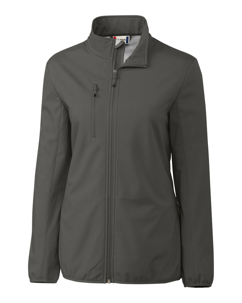 The Clique Trail Stretch Softshell Full Zip Womens Jacket is a sporty every day water-resistant jacket for work and for representing your school, college, team or company. This must have stretch softshell jacket is constructed from stretch softshell bonded to a micro-fleece interior for all day comfort. The year-round outerwear favorite includes a zippered chest pocket to keep your phone close at hand and two zippered on-seam pockets to keep your valuables secure. The one-color exterior contrasts with the brushed fleece interior for a subtle pop. Clique outerwear features no exterior branding so you can always count on Clique as a great company uniform, spirit wear, and as your everyday sporty essentials.