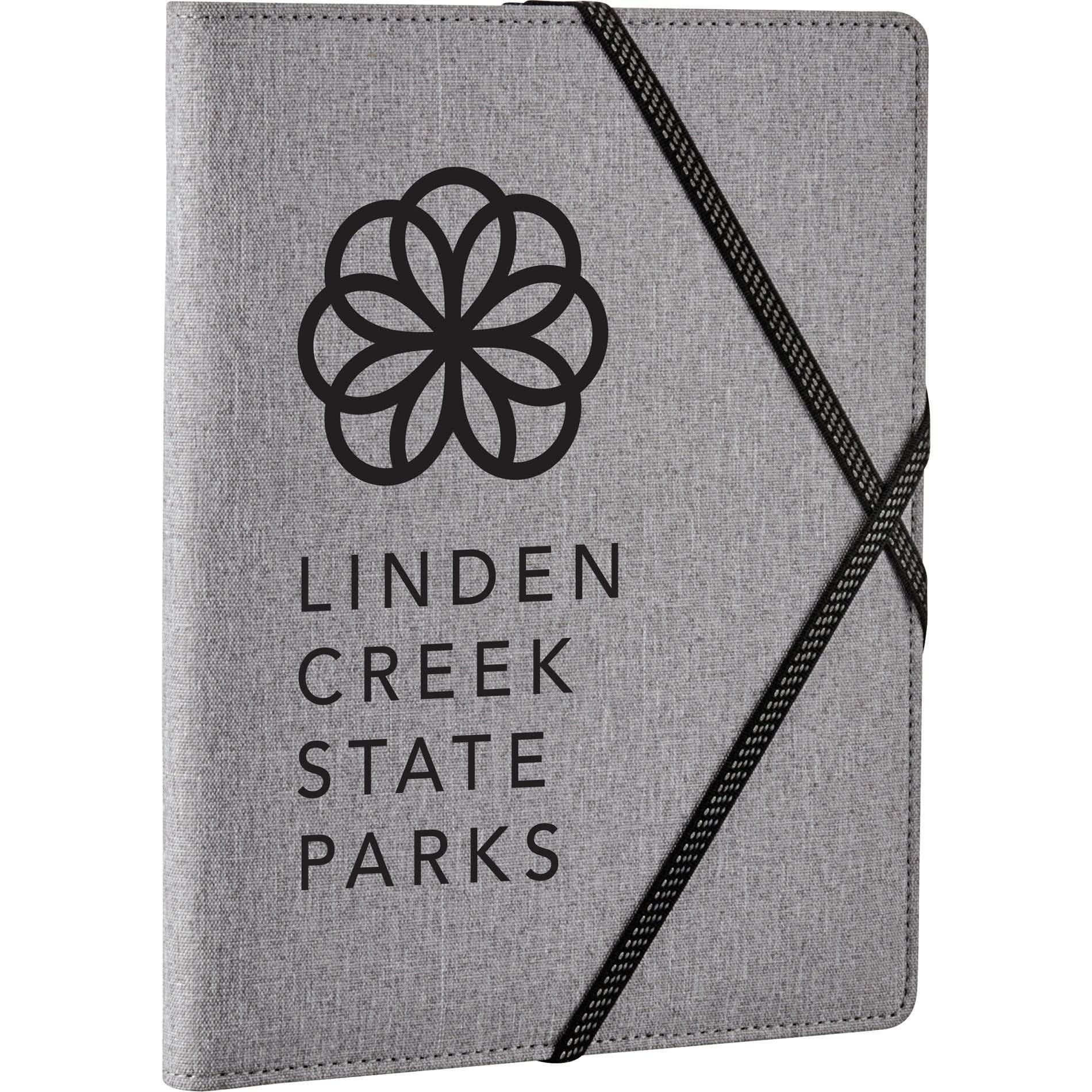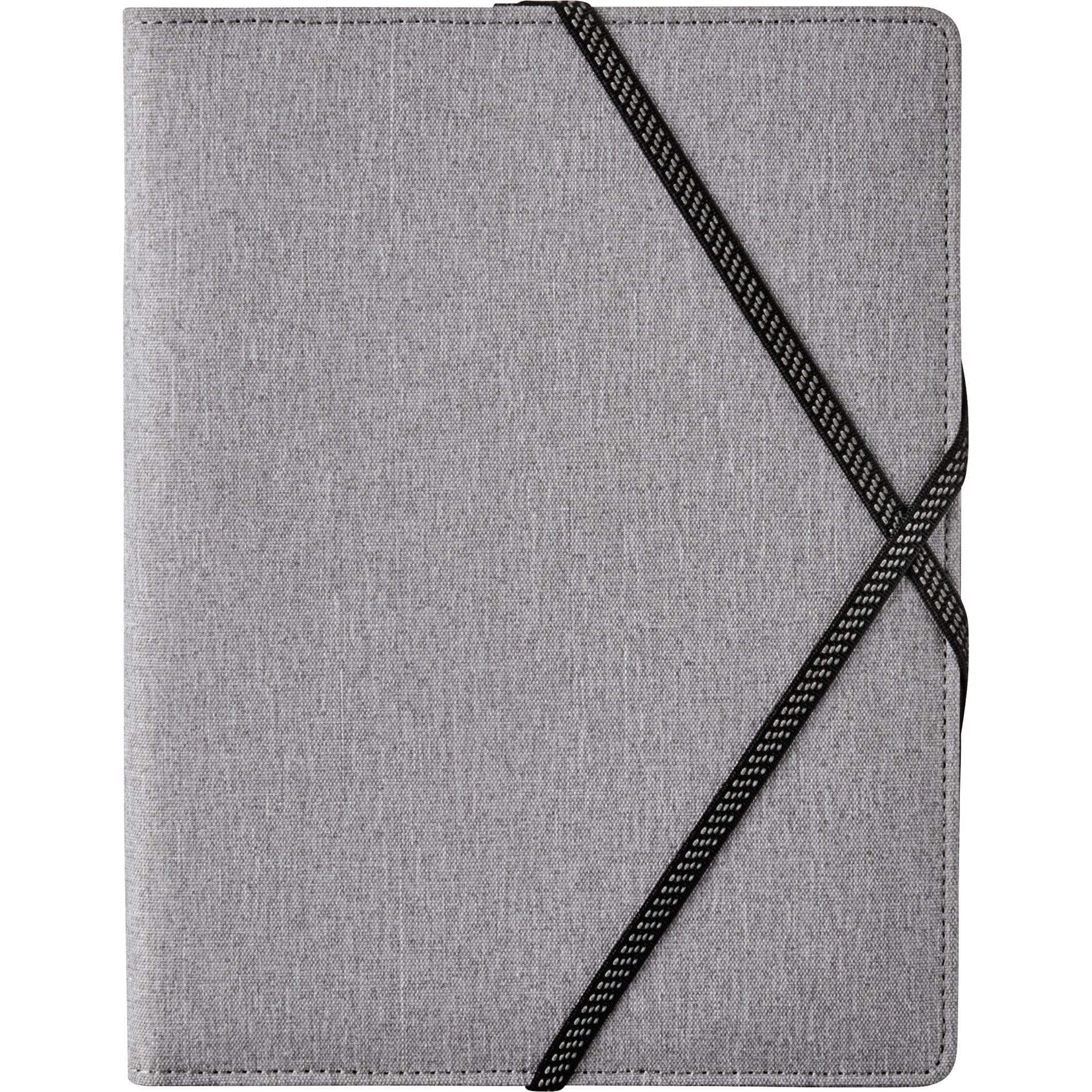The Heathered Writing Pad features a fabric cover with interior organization for business cards document pocket and pen loop. Exterior organization on back cover equipped with elastic strap closure.
