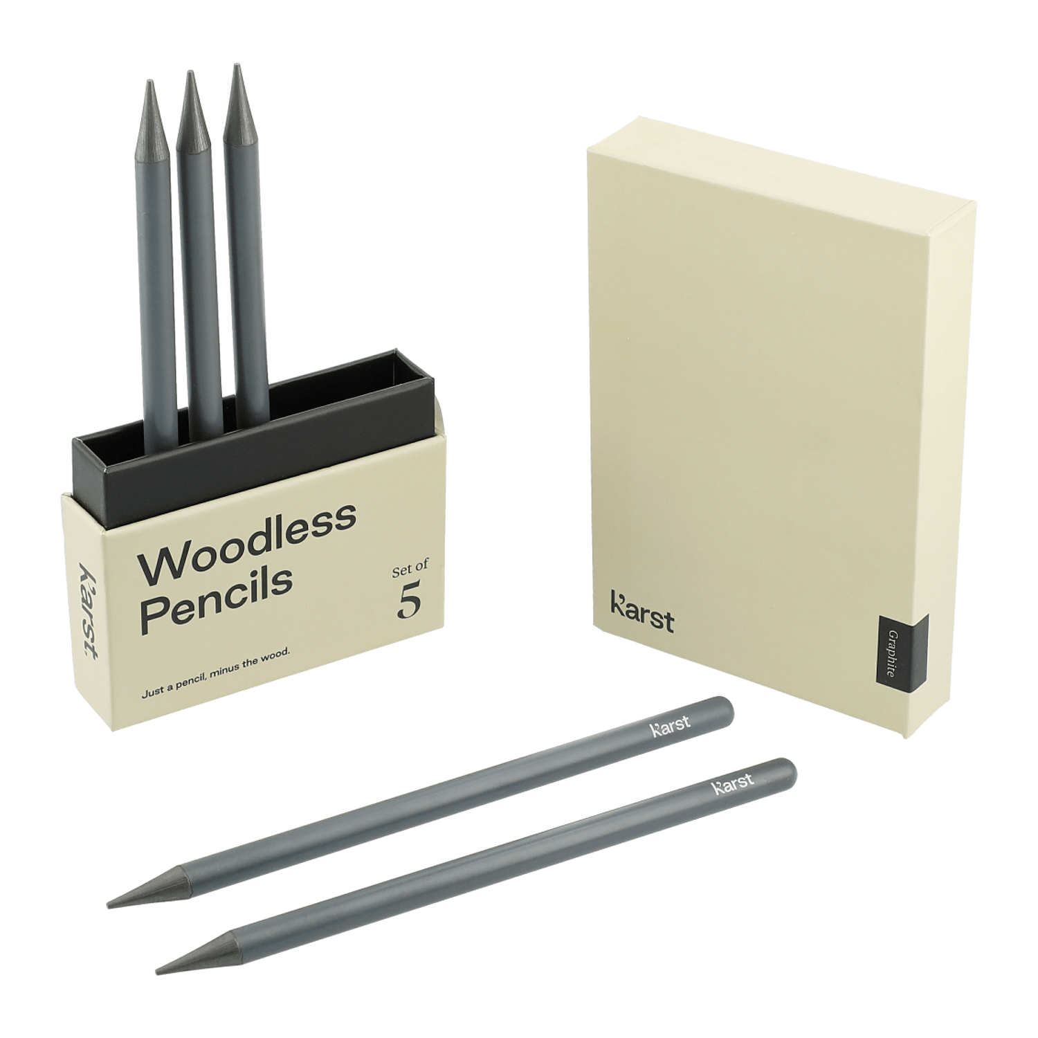 The Karst Woodless Graphite Pencils come as a set of 5 solid graphite pencils. Made of 100% pure graphite with 2B hardness, it’s the best lead grade for the Karst paper products. Matte coating to keep your fingers clean. Includes retail gift box.