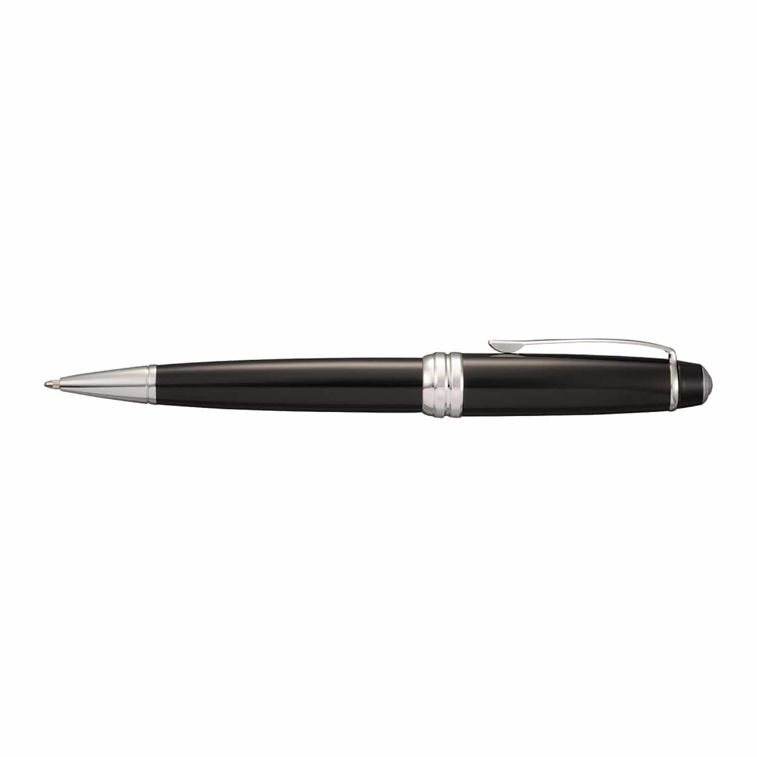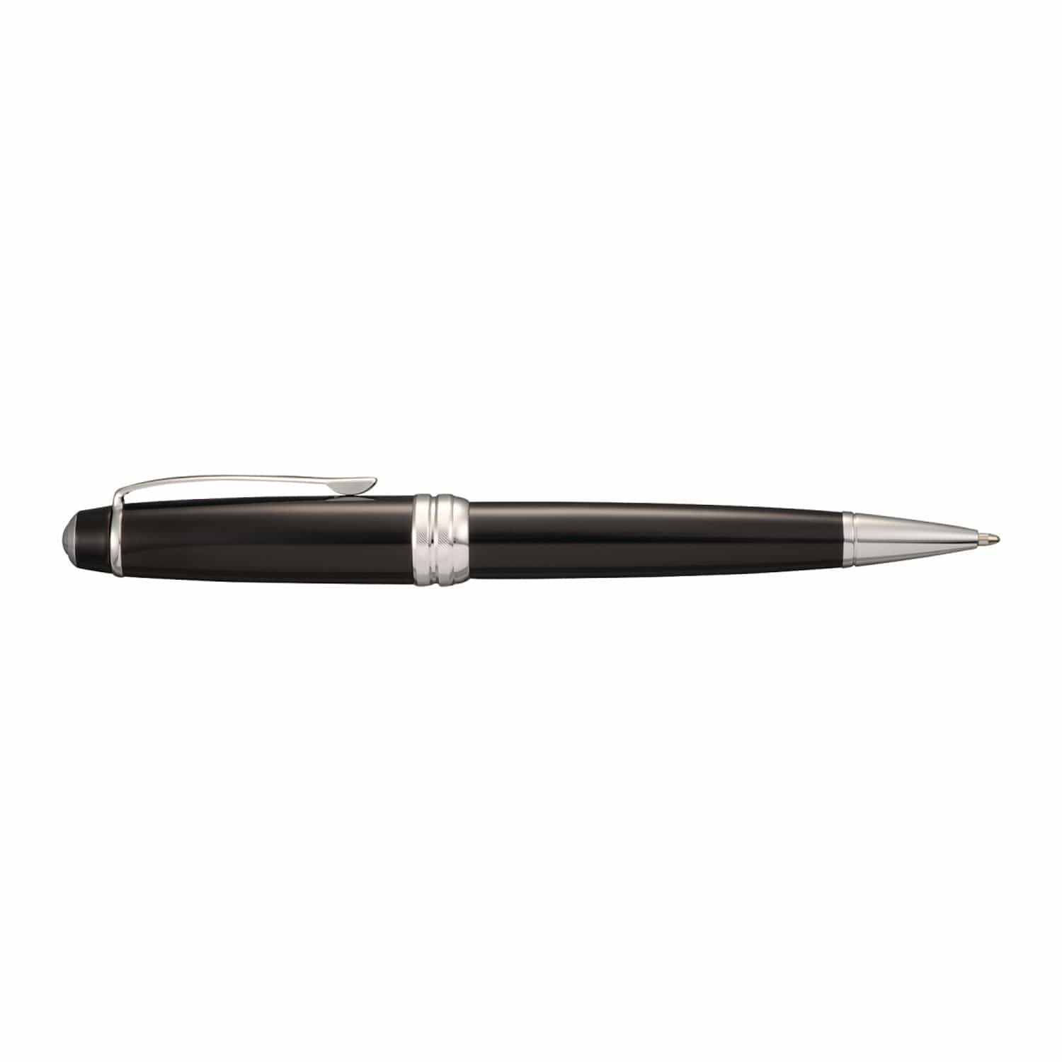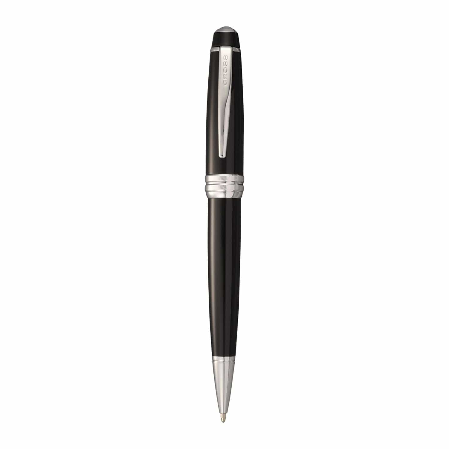 A simple articulation of modern Cross design, this elegant writing instrument features a traditional well-balanced profile in a selection of sophisticated finishes. A multi-grooved center ring with deep-cut engraved accents adds just the right amount of flair. Black lacquer finish with polished chrome appointments. Patented twist action propel/repel feature. Specially formulated ballpoint ink for a superior writing experience. Includes Cross® gift box and limited mechanical guarantee. Medium pen tip size. Black ink.