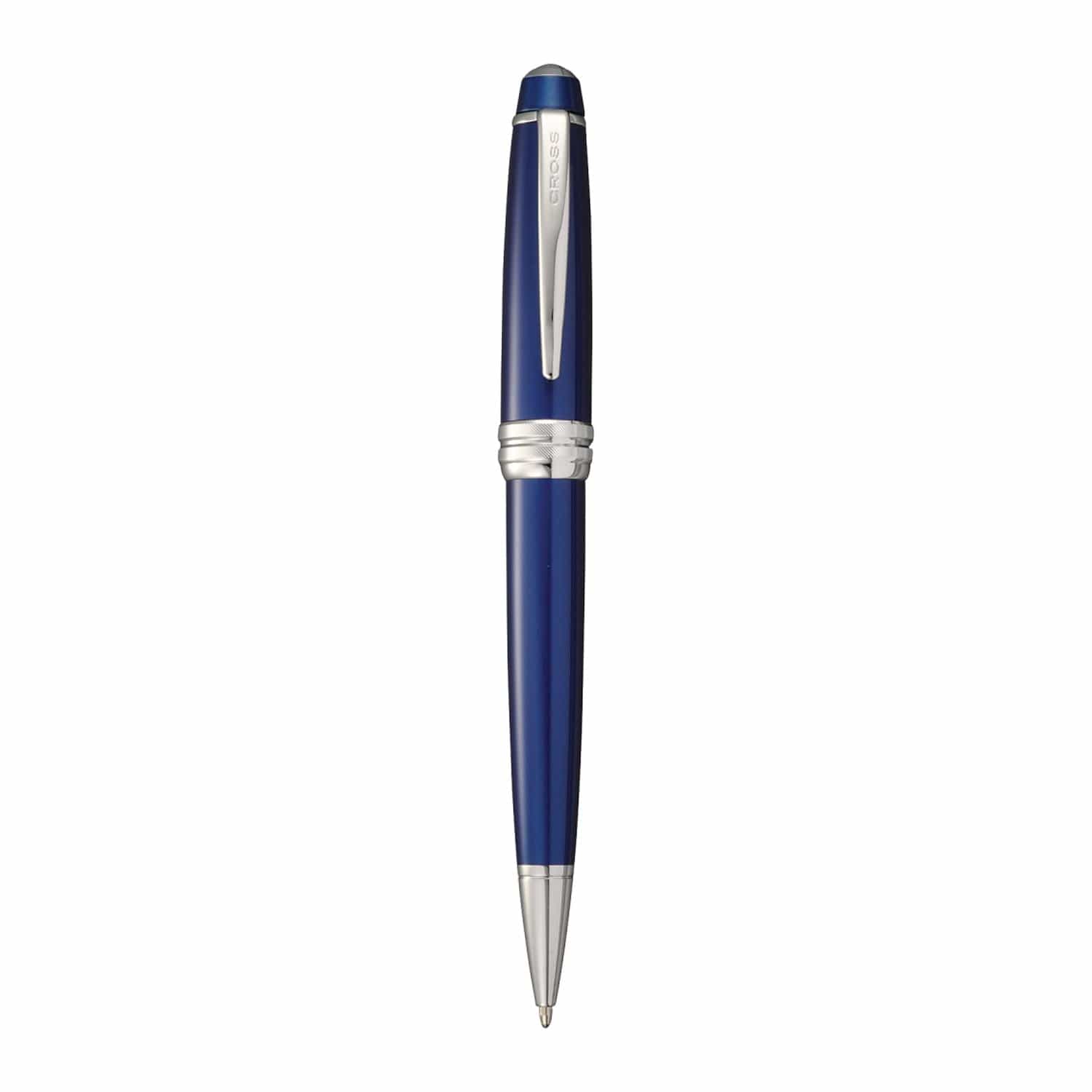 A simple articulation of modern Cross design, this elegant writing instrument features a traditional well-balanced profile in a selection of sophisticated finishes. A multi-grooved center ring with deep-cut engraved accents adds just the right amount of flair. Blue lacquer finish with polished chrome appointments. Patented twist action propel/repel feature. Specially formulated ballpoint ink for a superior writing experience. Includes Cross® gift box and limited mechanical guarantee. Medium pen tip. Black ink.