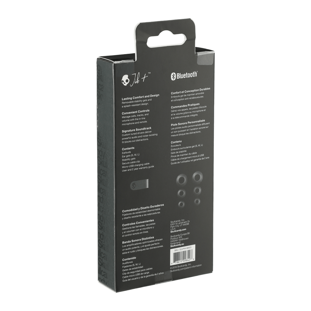 The Skullcandy Jib + Bluetooth Earbuds feature over six hours of playback time! The Jib + Bluetooth Earbuds are splash proof so you don’t have to worry about wearing them in a rainstorm or during your intense workout. The built in music controls allow you to control the volume, track, and answer/reject calls. The custom speaker drivers deliver powerful audio and the noised isolating fit blocks out distractions. Micro USB Charging Cable, Stability Gels, Cable Clip, and S/M/L Eargels included. Cable Length 34".