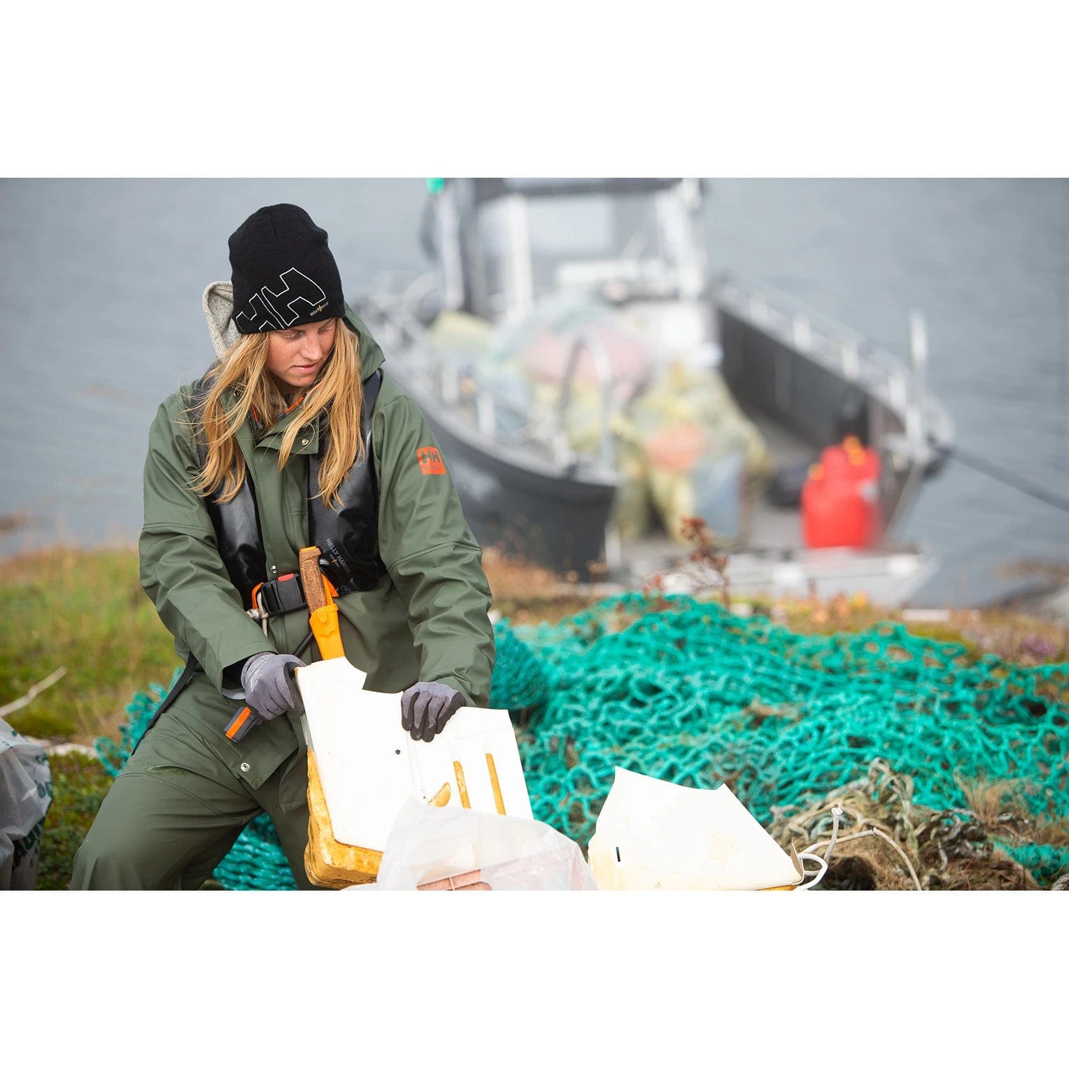 The Storm Jacket brings a new level of outerwear to commercial fishing. Focused on extremely durable fabrics and waterproof protection out at sea, the Storm also brings in stretch fabric to make movements on board even easier when the weather gets bad. Features like the neoprene cuffs and double storm flap over the front zipper prevents rain or spray from getting into the jacket, but the storm flap also conceals an inner zippered pocket that can hold valuables or provide music via the headphone hole. Phthalate free fabrics ensures low environmental impact while at the same time keeping you dry no matter the weather.