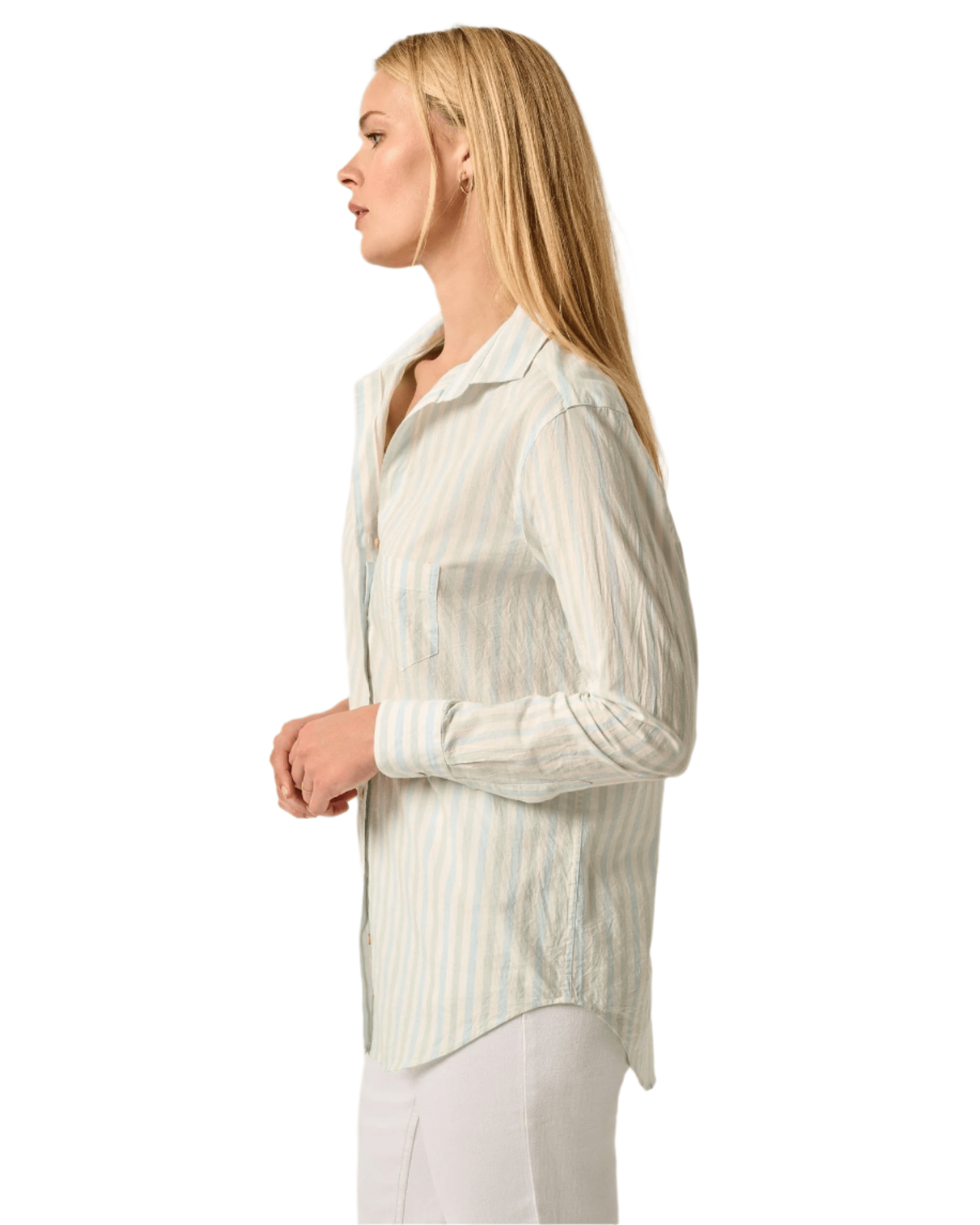 Cut with a relaxed fit and finished with sharp details—like a French placket—this seaside-stripe cotton button-down nails that breezy, beachside feel. It’s effortless, it’s classic, and it’s ready for everything from dockside hangs to dinner in town.