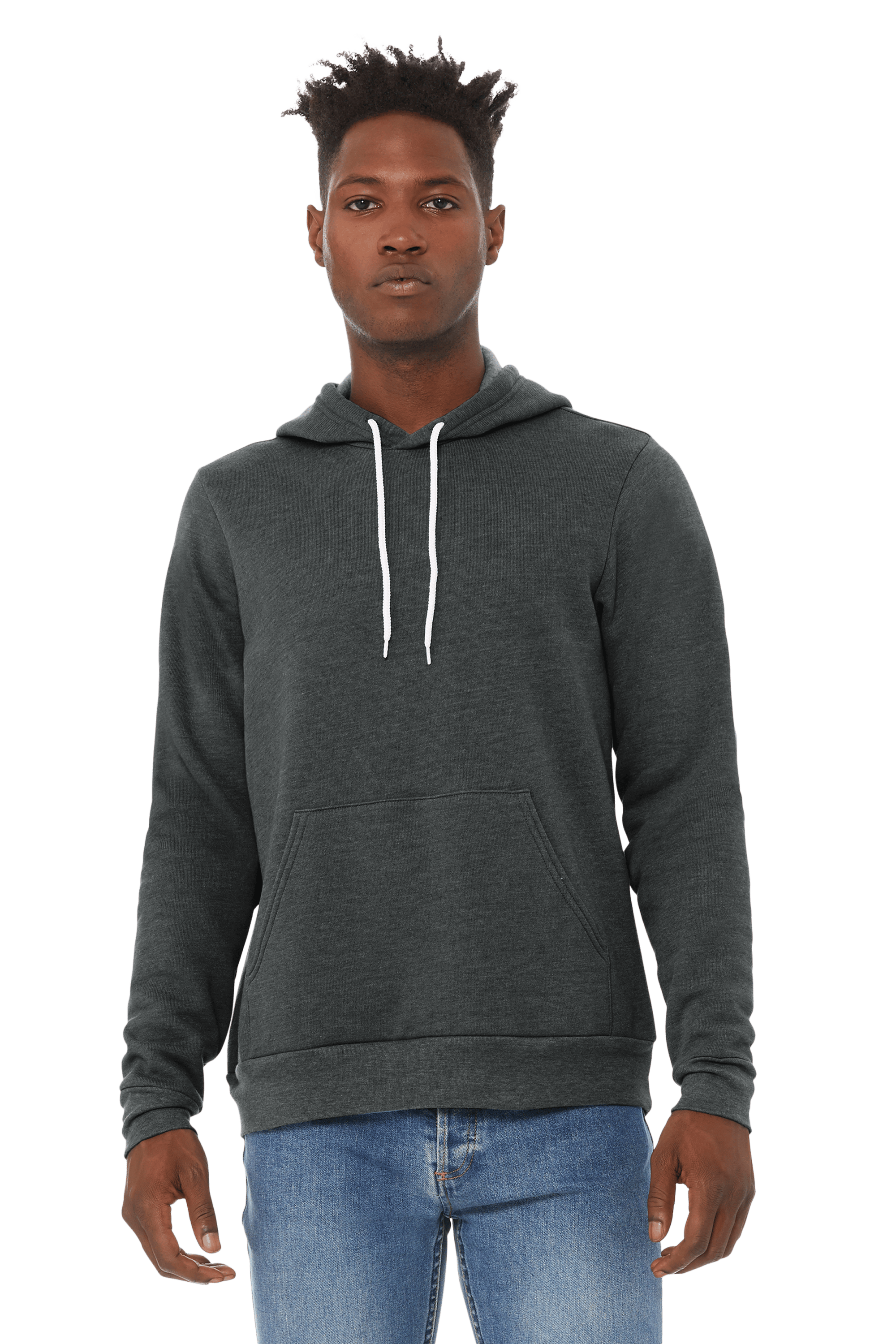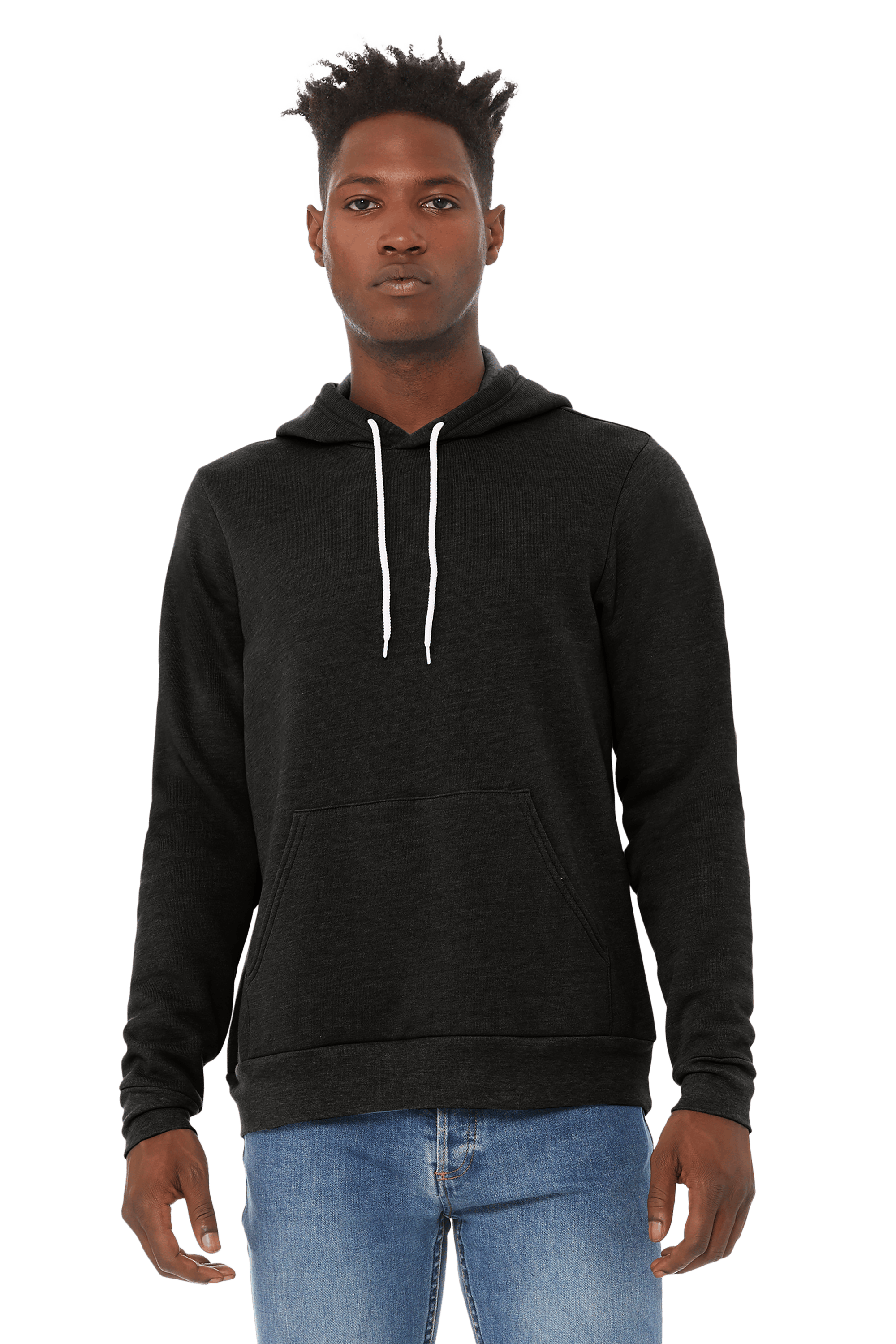 Black Heather: 8-ounce, 85/15 Airlume combed and ring spun cotton/poly fleece, 32 singles