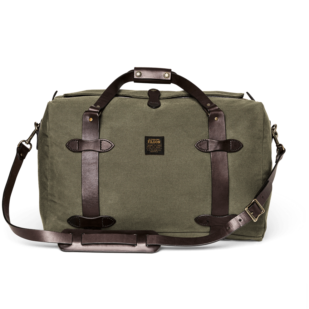 Our Rugged Twill Duffle Bags embody the philosophy that's guided Filson since 1897, making products that are handed down rather than tossed out. Made with our signature Rugged Twill and Bridle Leather, our Medium Duffle Bag is built tough enough for the most extreme excursions and sized for long weekends and multi-day trips. The lightly waxed fabric keeps gear dry and closes with a solid brass YKK® zipper that's protected by a snap-secured storm flap. We use Bridle Leather from Wickett & Craig for the removable shoulder strap and for the handles that wrap around the bag to securely cradle heavy loads. Interior end-cap pockets for organization.