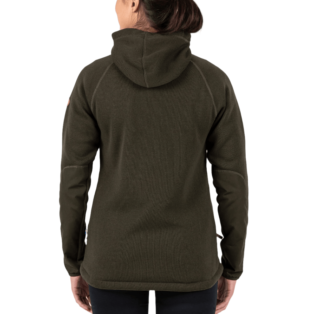 Warm and cosy fleece jacket with a knitted exterior and a soft brushed inside. Perfect as an insulating mid layer under a shell jacket on autumn or winter adventures, and just as comfortable for long afternoons with a good book in front of the fire. It has a fixed hood with a drawcord adjustment and the zipper at the front has a protective flap in G-1000 original that protects the chin. The elbows, hem, pockets and inside of the edge of the hood also have G-1000 for extra durability. Two spacious pockets with zippers. Elastic binding at the sleeve cuffs and drawcord adjustment at the hem. The fleece and mesh lining in the pockets are made from recycled polyester and produced using an environmentally friendly process that both spins and dyes the fibres at the same time. This leads to much lower levels of water and energy consumption compared to traditional dyeing techniques.