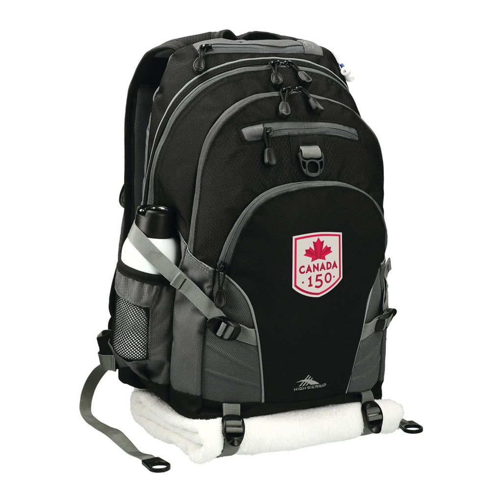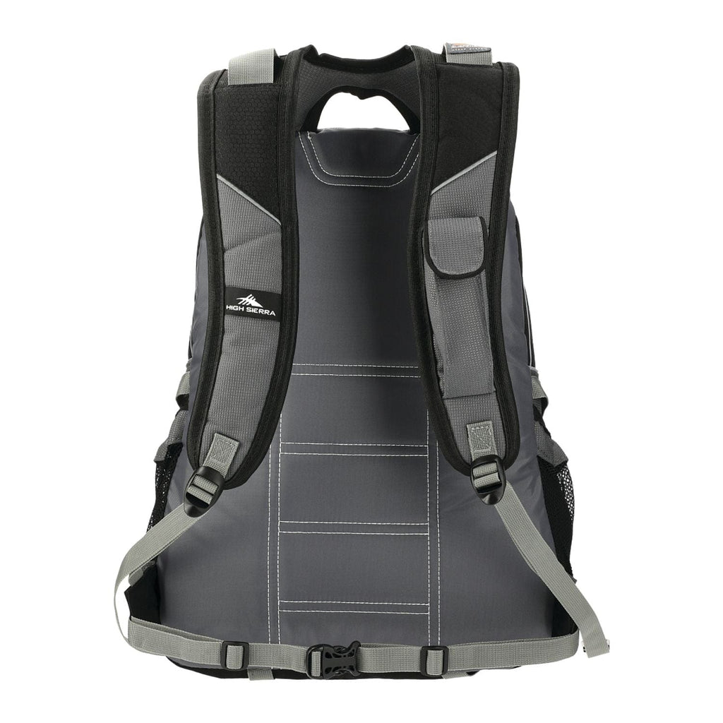The High Sierra Loop Backpack features a multi-compartment design to provide you with ample storage. It's packed with convenient features, including a zippered media pocket with a headphone port, two side mesh water bottle pockets, and a hanging accessory pocket. The backpack also comes with an organizer that has a zippered mesh pocket, built-in pen pockets, and a removable key fob. Its yolk-style, S-shaped Vapel mesh shoulder straps and padded back panel are designed for comfortable wear, along with its adjustable waist belt and integrated grab-handle.