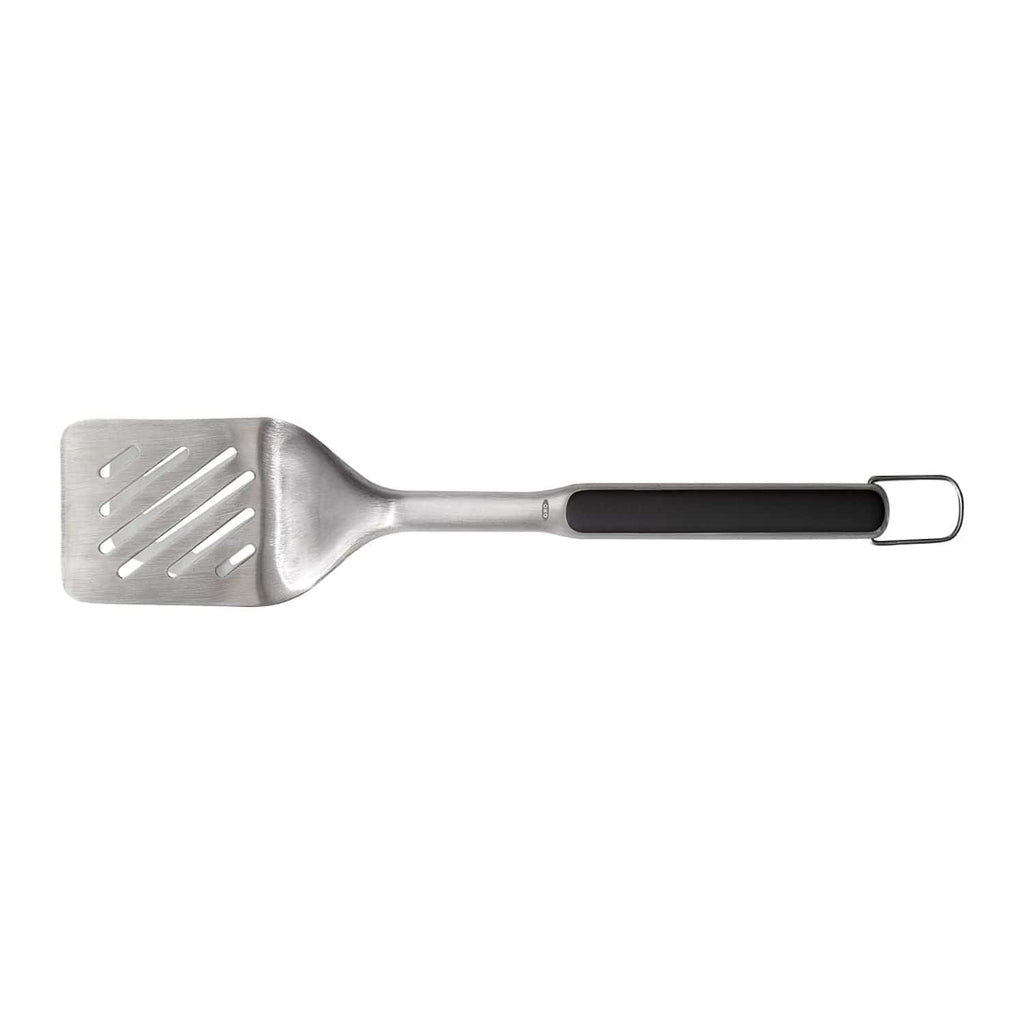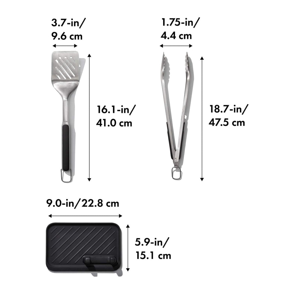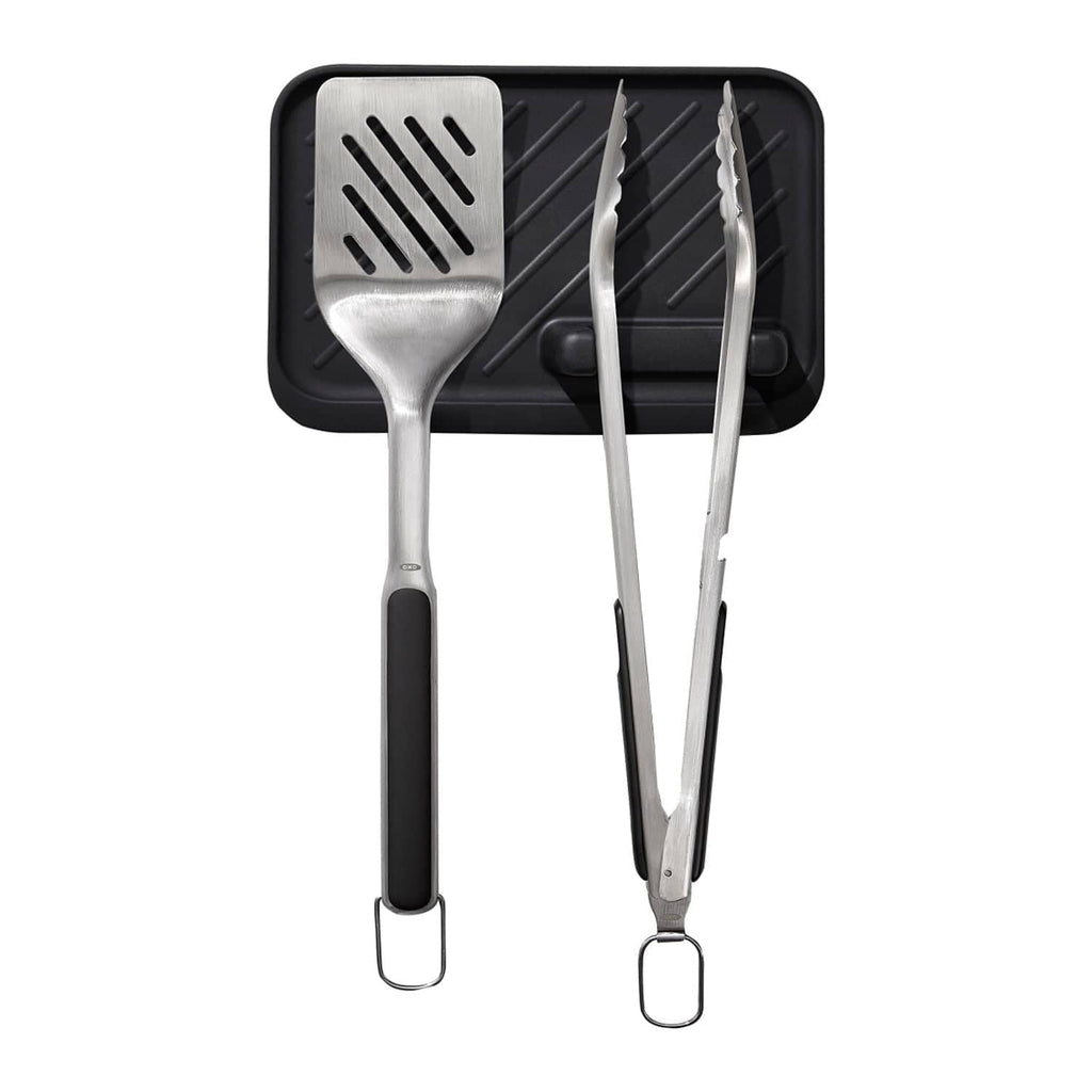 The OXO Good Grips 3-Piece Grilling Tool Set is a must-have for beginner and seasoned grillers alike. The set includes Grilling Tongs (with scalloped edges for fumble-free grabbing and a built-in bottle opener for grill-side sipping). A Grilling Turner (with a double-bend design for leverage while flipping). Finally, the Grilling Tool rest provides a neat, heat-resistant surface to rest your tools while you grill. The non-stick silicone construction and unique tong holder help with one-handed use–no more locking and unlocking tongs between turns. The tongs and turner have extra-long handles and non-slip grips for comfort and control. Non-decorated components are dishwasher safe.