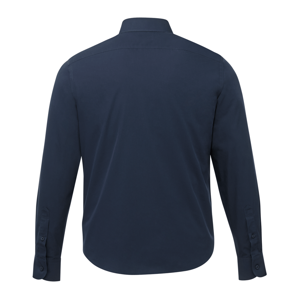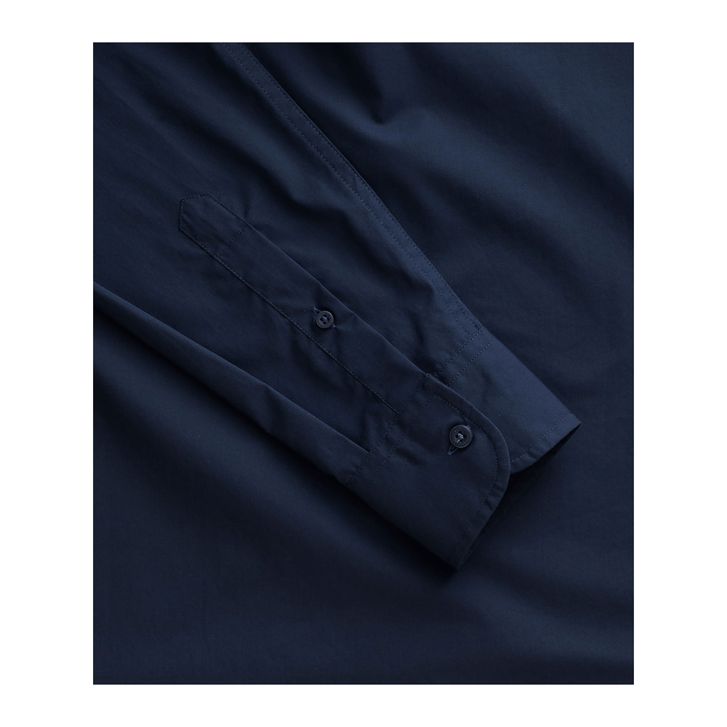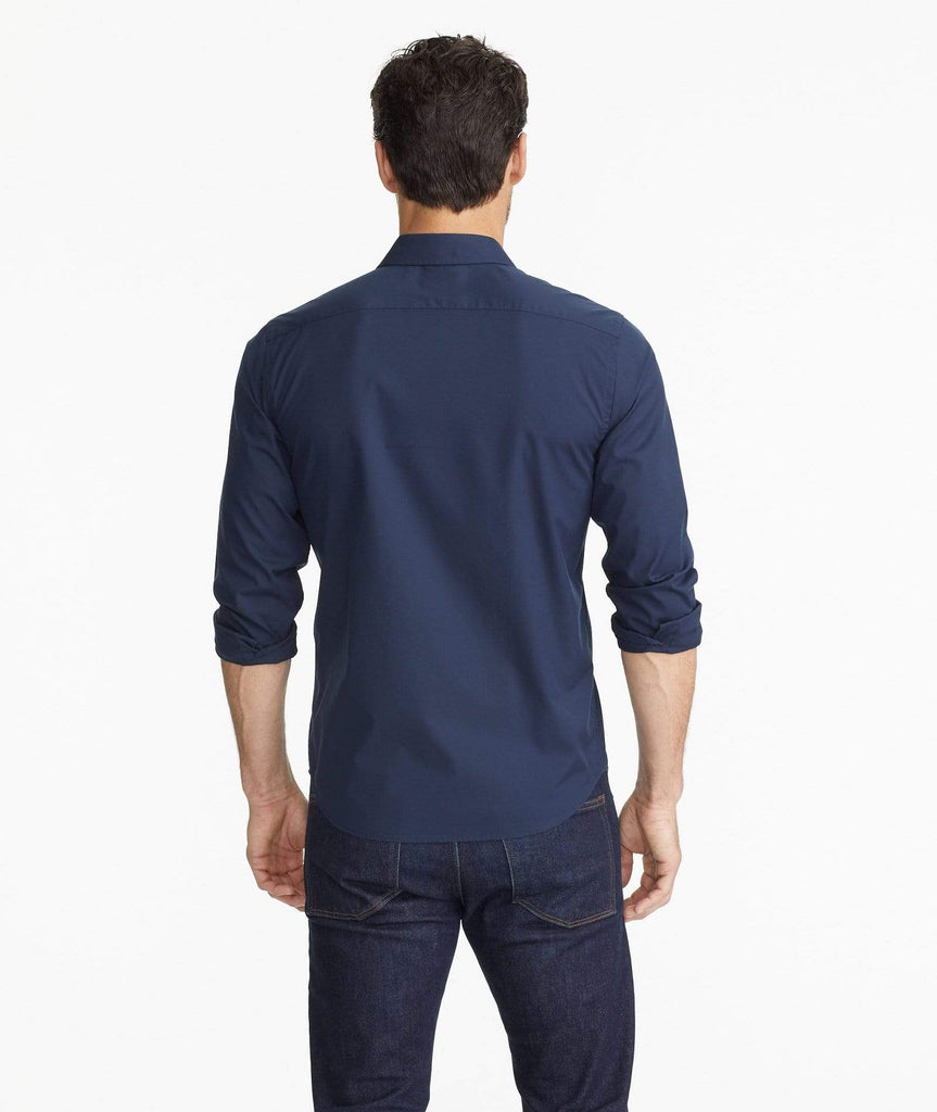 Crisp, clean, and cut for the perfect length, this navy blue shirt stands out from the rest. It's woven from simply gorgeous cotton poplin that's thin enough to wear in sweltering heat, yet durable enough to get you comfortably through the winter months. Plus it's now wrinkle free so you can toss your iron for good!