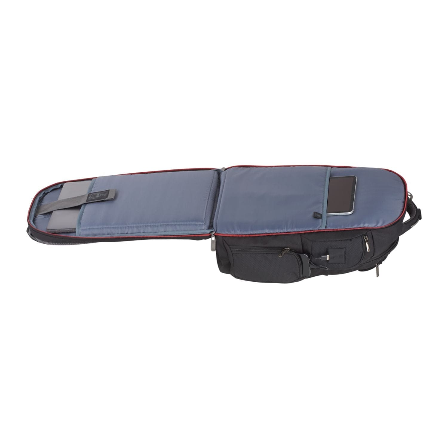 USB Port, Waterbottle Pocket, Laptop Compartment, Organizational Pocket, Trolley Sleeve