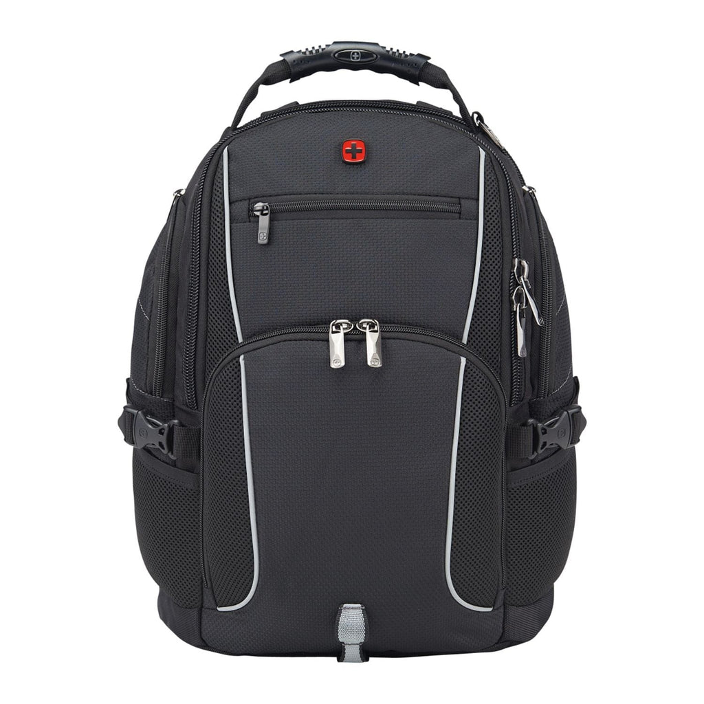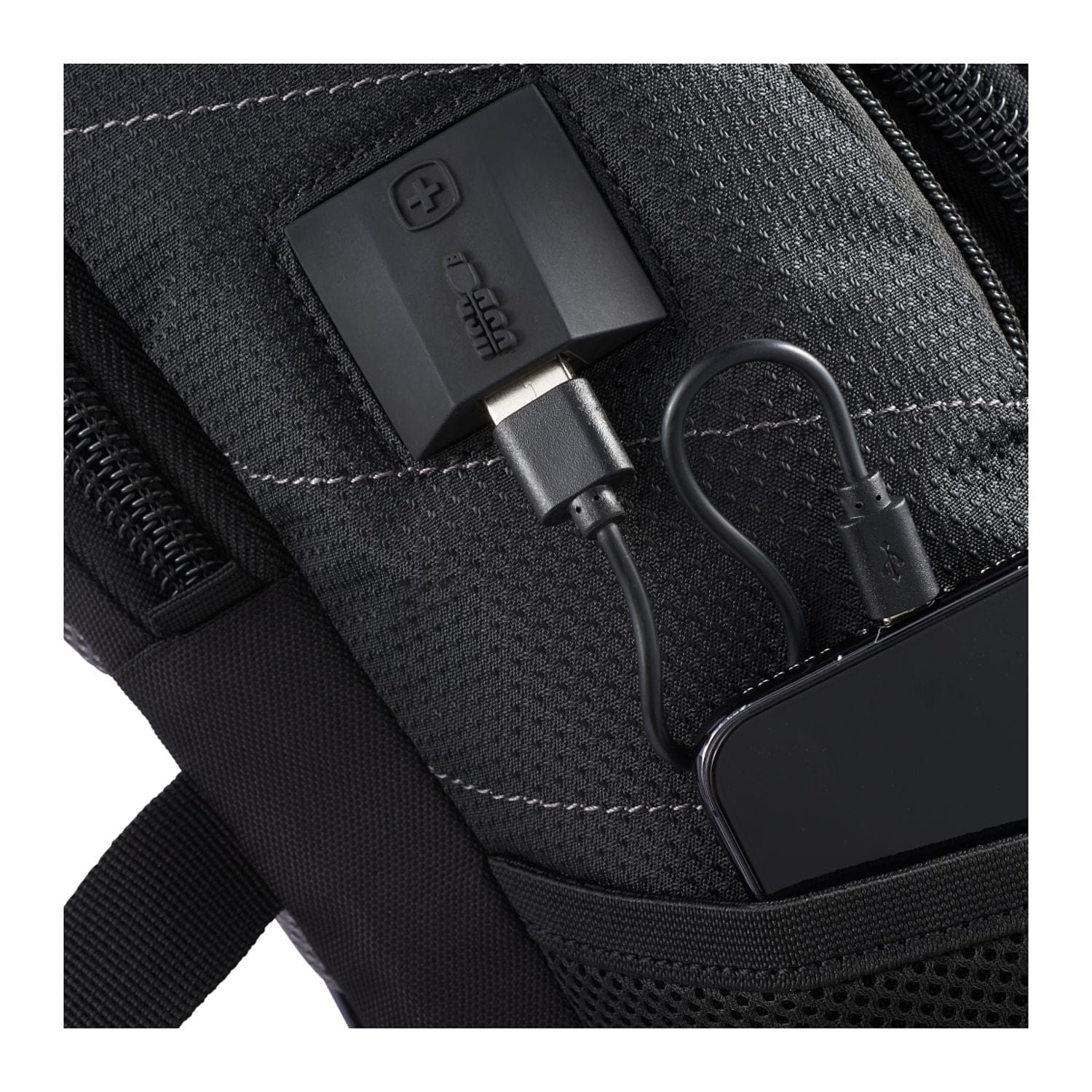 The Wenger Pro II 15'' Computer Backpack combines style and luxury and is made from RPET. This backpack has it all, a 15” computer sleeve, dedicated USB port with cable compartment, adjustable buckle compression straps, two side mesh water bottle pockets and a dedicated phone pocket on the shoulder strap. Organize your belonging in the easy access, lined front valuables pocket, the zippered mesh pocket on the interior front wall, front organizational pocket, back pocket with RFID protection or in the large zippered main compartment. This backpack features Wenger’s Airflow moisture-wicking mesh, shock absorbent backpack strap and an adjustable chest strap.